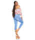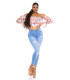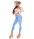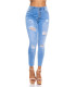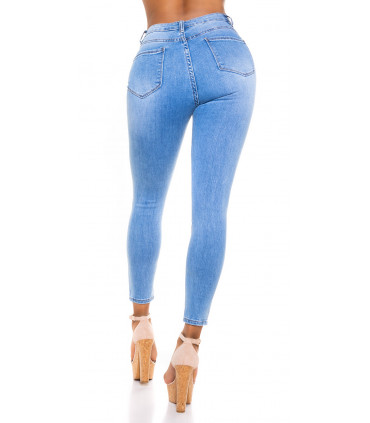Blue high-waisted ripped jeans with buttons. Suitable for a woman 165cm tall when used full-length (can be also used as capri pants) and best suited to ladies with a narrow waist.