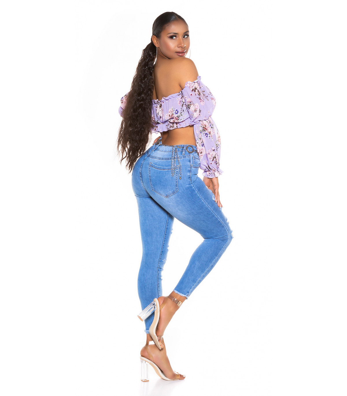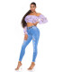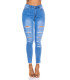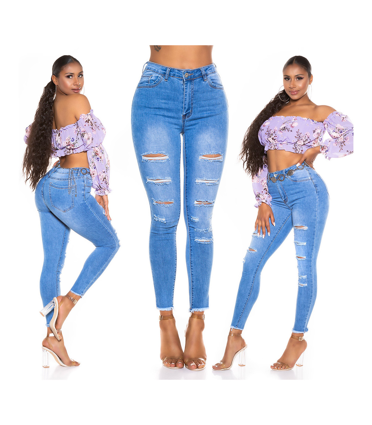 Blue high-waisted ripped jeans with slits. Suitable for a woman 165cm tall when used full-length (can be also used as capri pants) and best suited to ladies with a narrow waist.