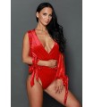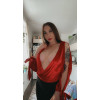 Punainen pitkähihainen syvään uurrettu wrap-look v-body halkiohihoilla. Sopii parhaiten n. 165-senttisille.