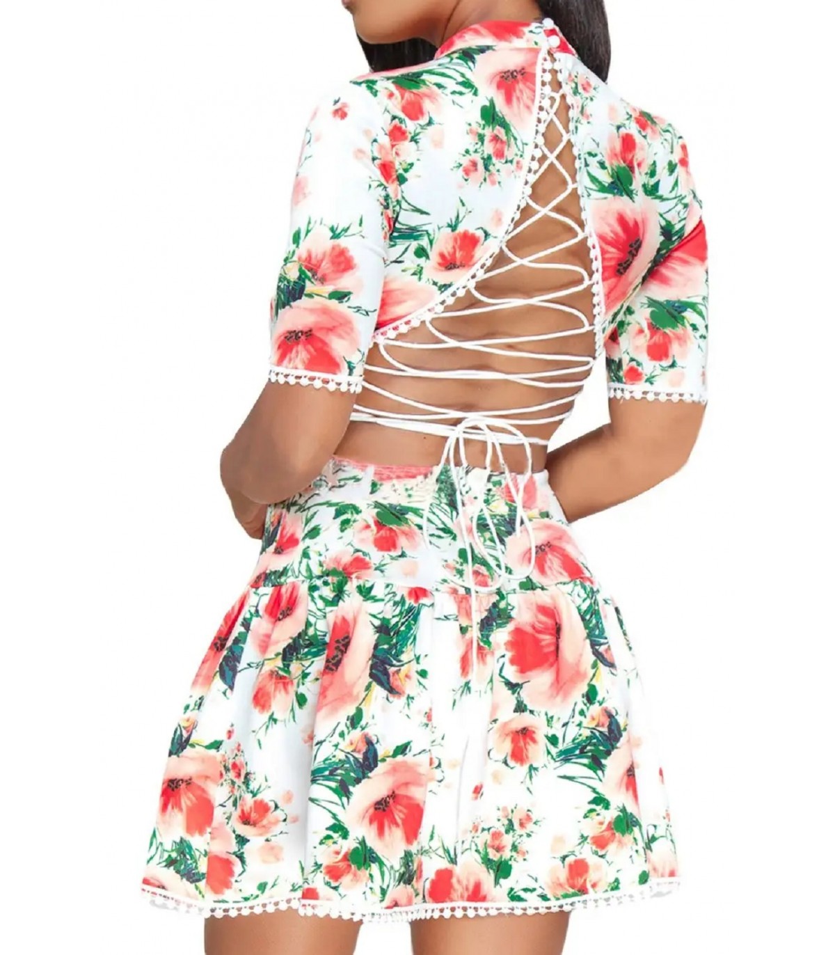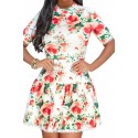 Valkoinen lyhythihainen kukkakuvioinen nyöriselkäinen skater-mekko.
