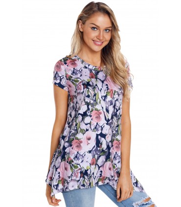 Kukkakuvioinen lyhythihainen epäsymmetrinen väljä paita. Saatavilla vain tämä erä - emme saa tuotetta näillä näkymin enää lisää.