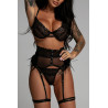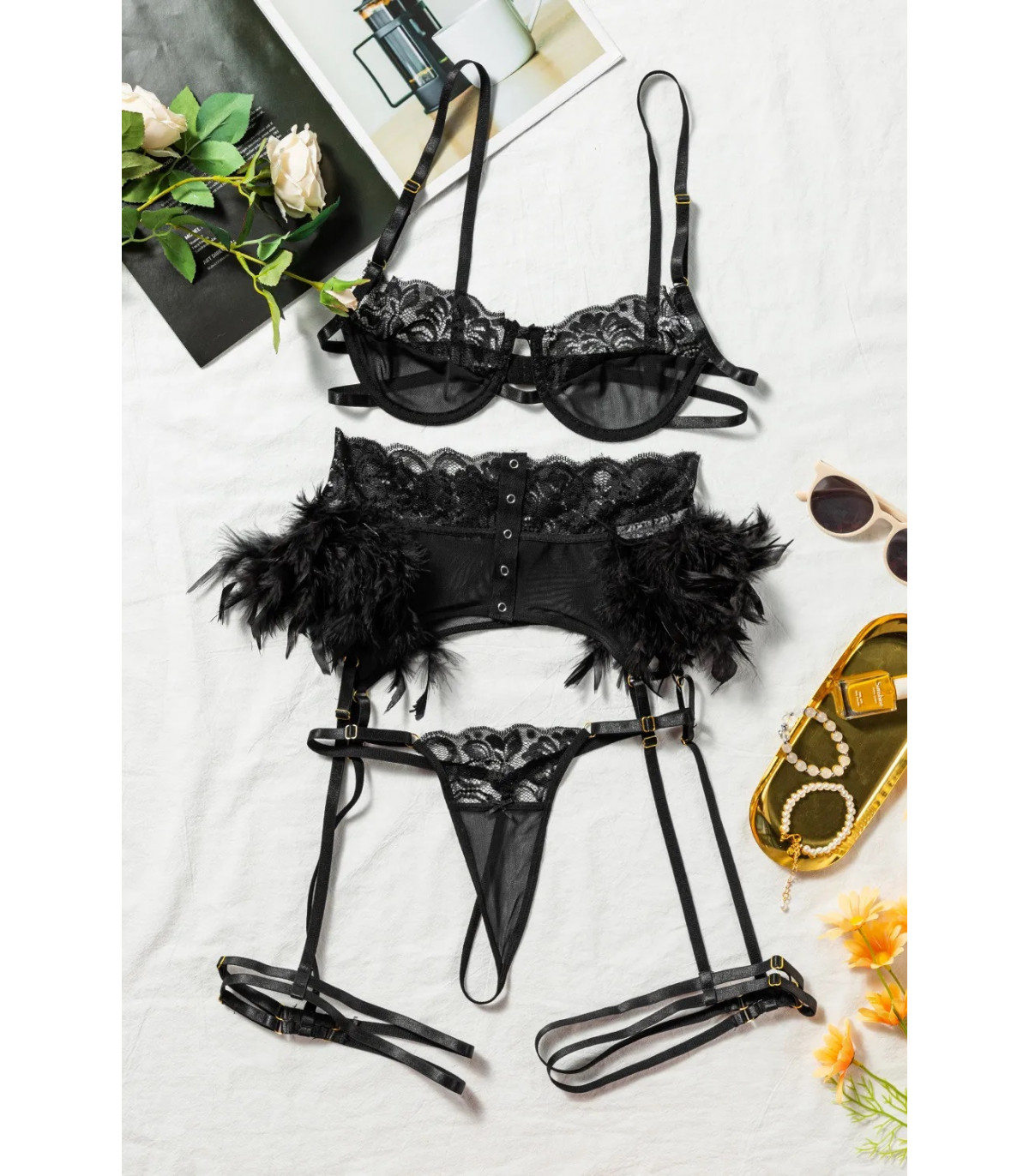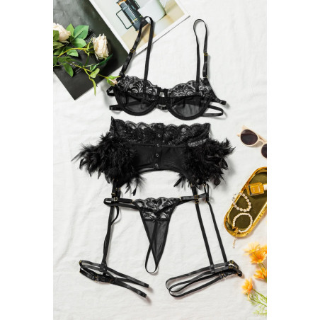 Musta pitsikoristeinen sukkanauhaliivisetti höyhenillä