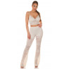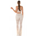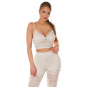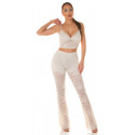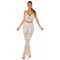Upea beige pitsinen housusetti - käytä yhdessä tai erikseen! Beige lyhyt pitsitoppi on helppo yhdistää myös muihin alaosiin, kuten hameiden ja shortsien kanssa. Korkeavyötäröiset beiget pitsiset housut ovat näyttävä vaate, jossa voi tuntea olosi upeaksi. Läpikuultavat pitsilahkeet tekevät housuista kevyet päällä myös kuumemmilla keleillä. Korkeavyötäröiset pitsihousut näyttävät upeilta myös esimerkiksi bodyjen tai erilaisten lyhyiden yläosien kanssa. Kokeile housuja myös tyylikkään puseron kanssa laittamalla puseron helma vyötärön sisään. Naisellinen housusetti on näyttävä asu erilaisiin juhliin ja kokoontumisiin sekä esimerkiksi treffeille.