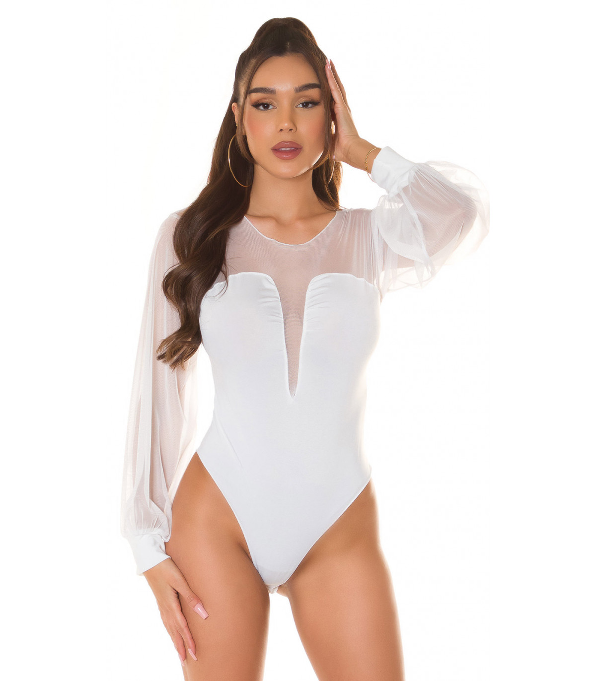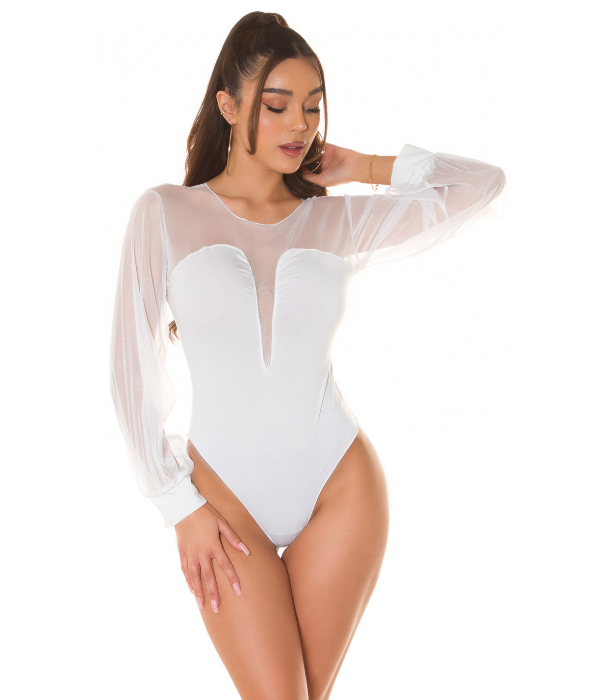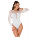 Upea valkoinen pitkähihainen mesh-koristeinen body - erotu eduksesi juhlissa ja bileissä