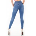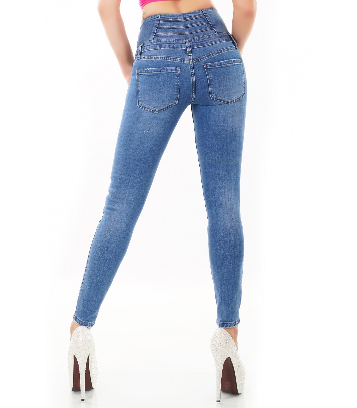 Siniset korkeavyötäröiset farkut näyttävillä yksityiskohdilla. Farkut sopivat parhaiten n. 165-senttisille ja lantioon nähden kapeavyötäröisille. Lantionympärys vastaa normaalia kokoa, vyötärönympärys on pienempää mitoitusta.