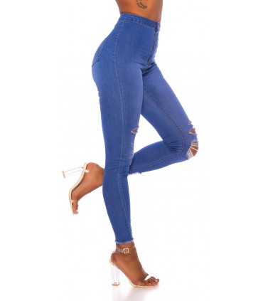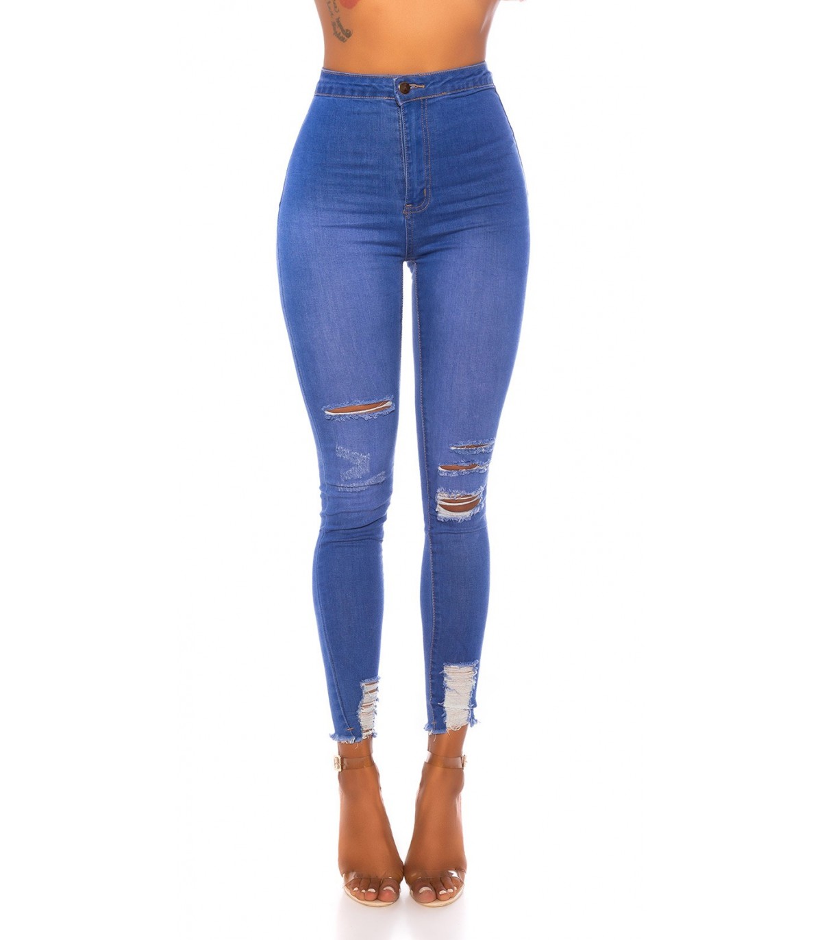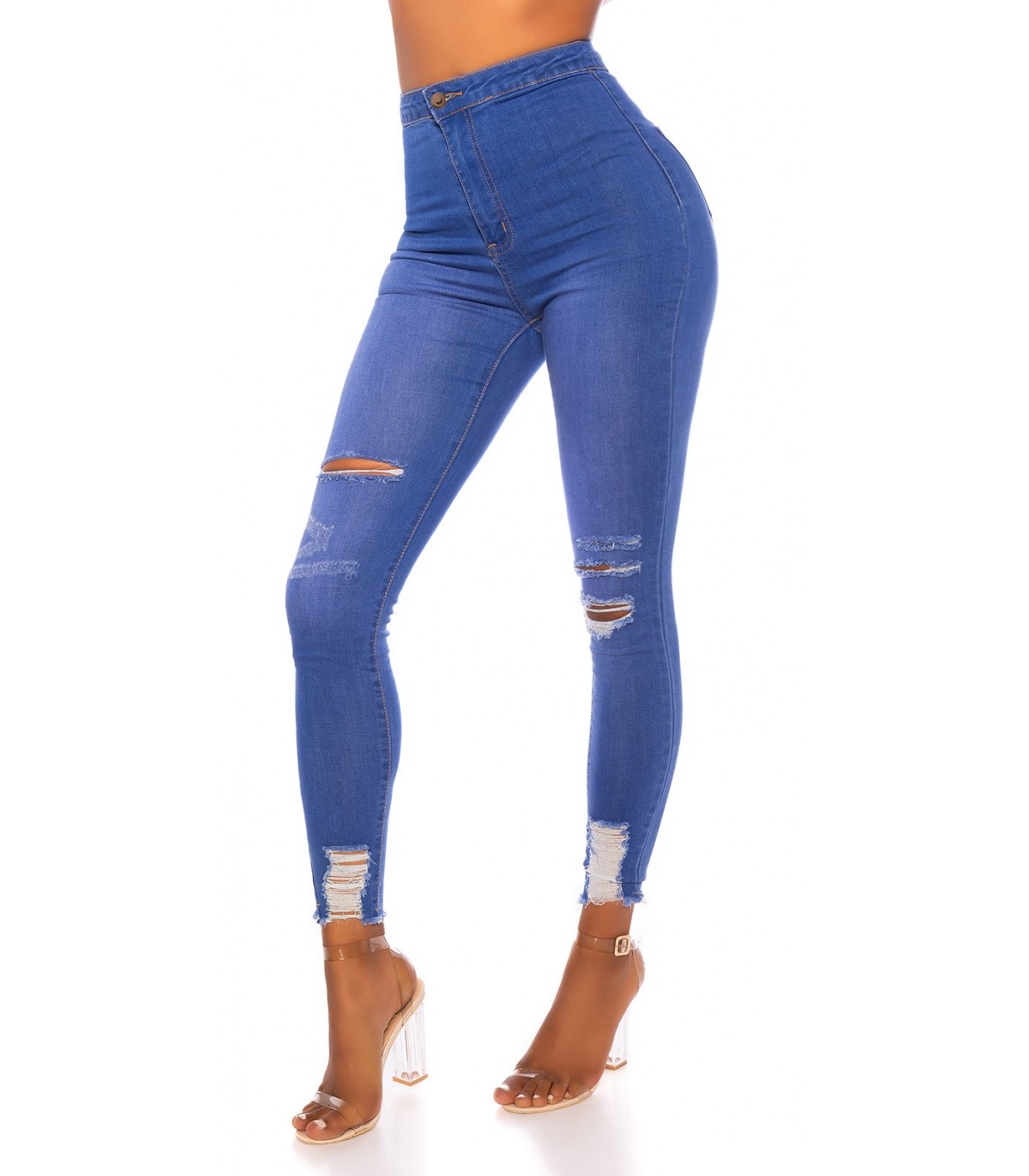 Siniset korkeavyötäröiset kulutetut farkut halkioilla