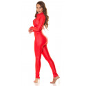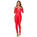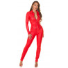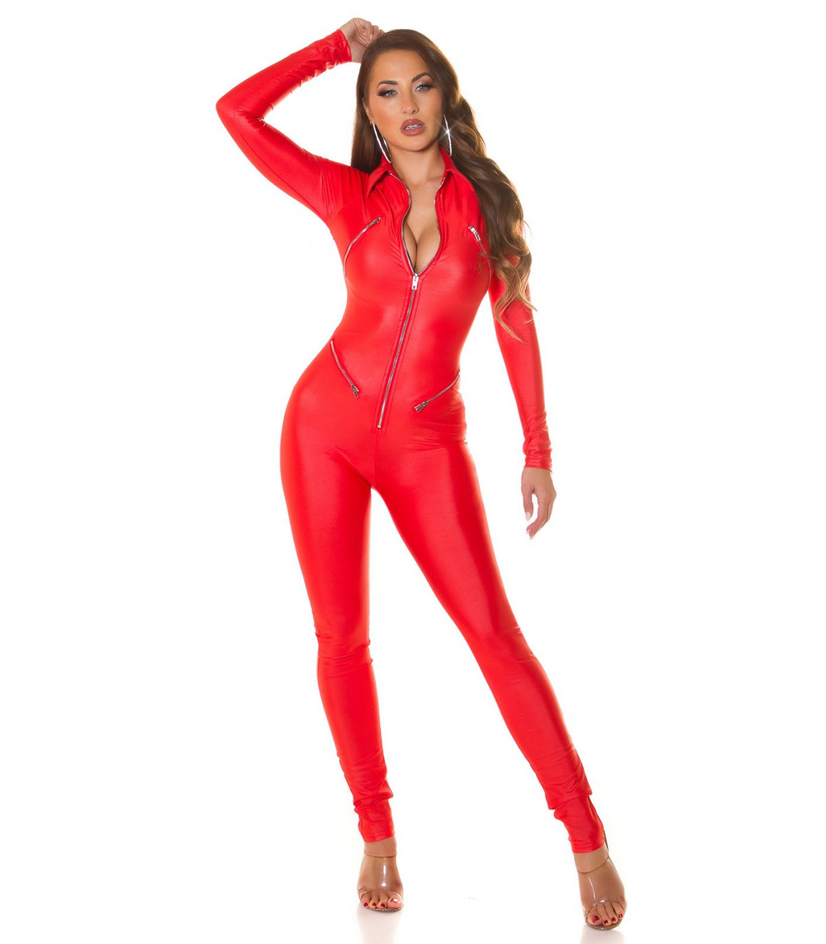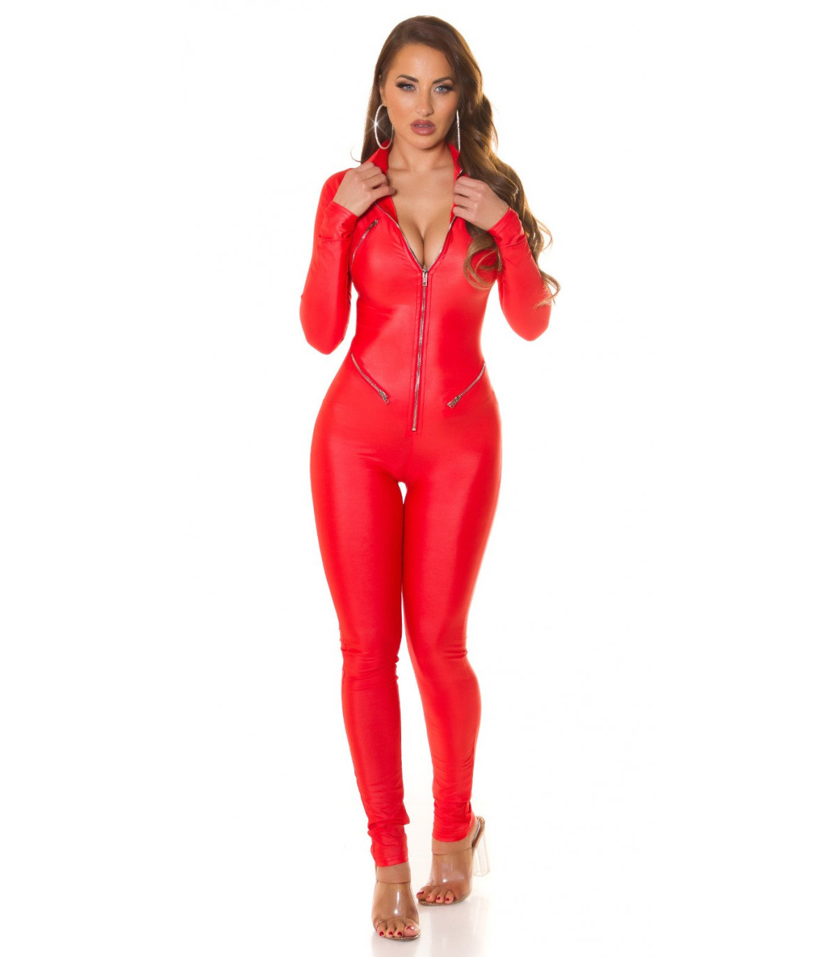 Punainen pitkähihainen tekonahkainen jumpsuit vetoketjuilla. Kun haussasi on erittäin seksikäs vaate, joka korostaa vartalosi muotoja, on tämä punainen keinonahkainen haalariasu erinomainen valinta. Pitkät hihat ja pitkät lahkeet tekevät asusta peittävän, mutta vaikka vetäisit vetoketjun aivan kiinni asti, ei asua voi kukaan sanoa tylsäksi. Päätät itse miten peittävän tai paljastavan haluat asun kulloinkin olevan, sillä voit jättää edessä olevan vetoketjun osittain myös auki. Avaamalla vetoketjua voit tehdä asusta seksikkäämmän paljastamalla hieman povea.