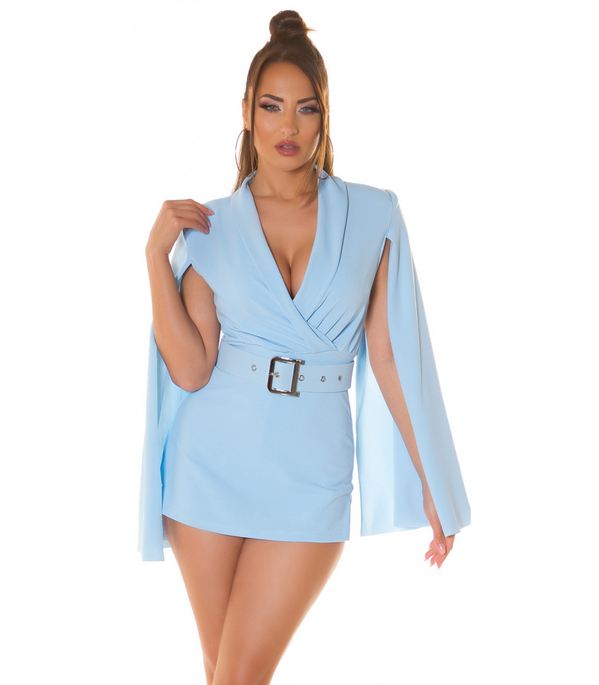 Koucla vaaleansininen shortsihame v-playsuit avohihoilla ja vyöllä