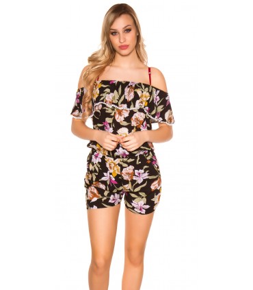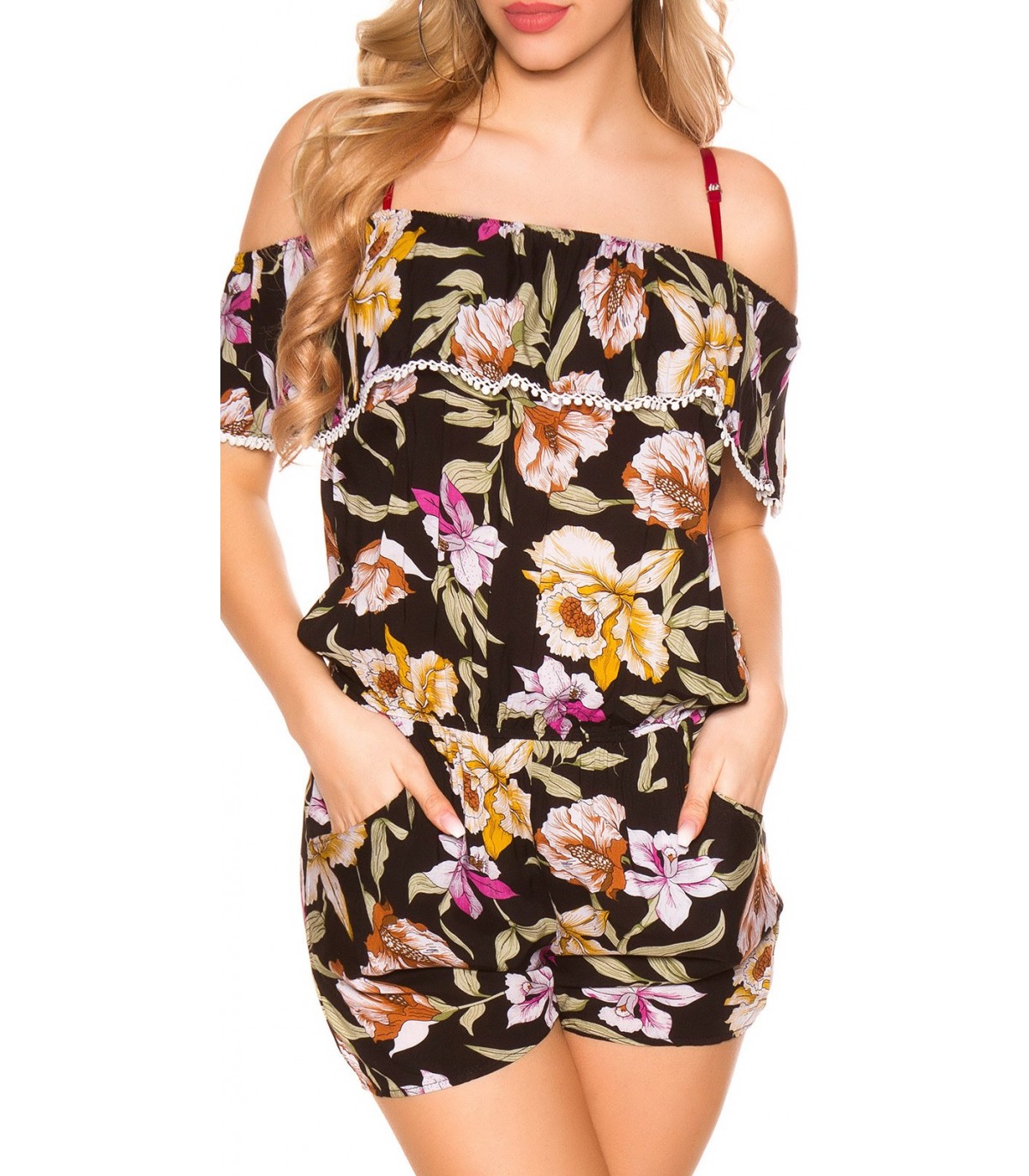 Musta kukkakuvioinen off-shoulder playsuit [LÖYTÖ]