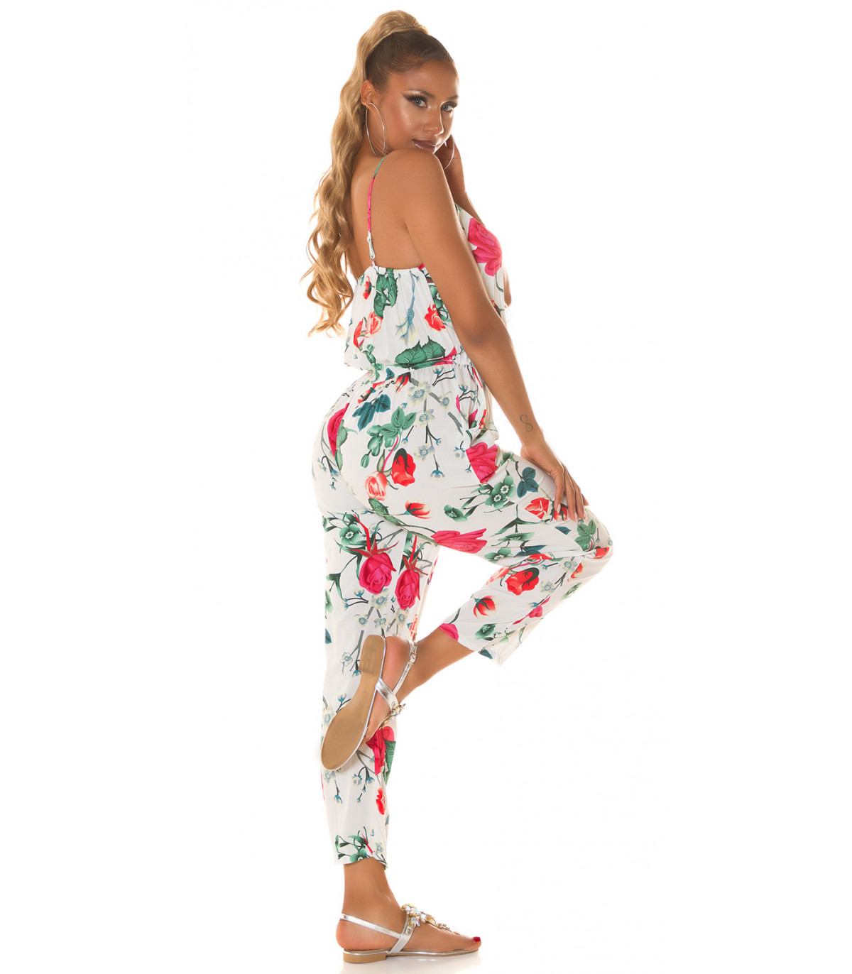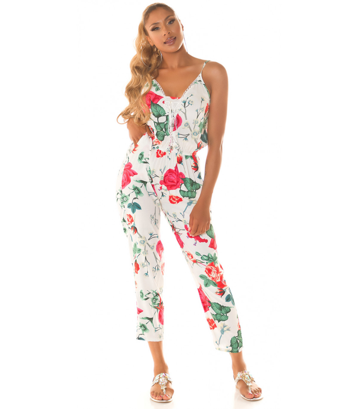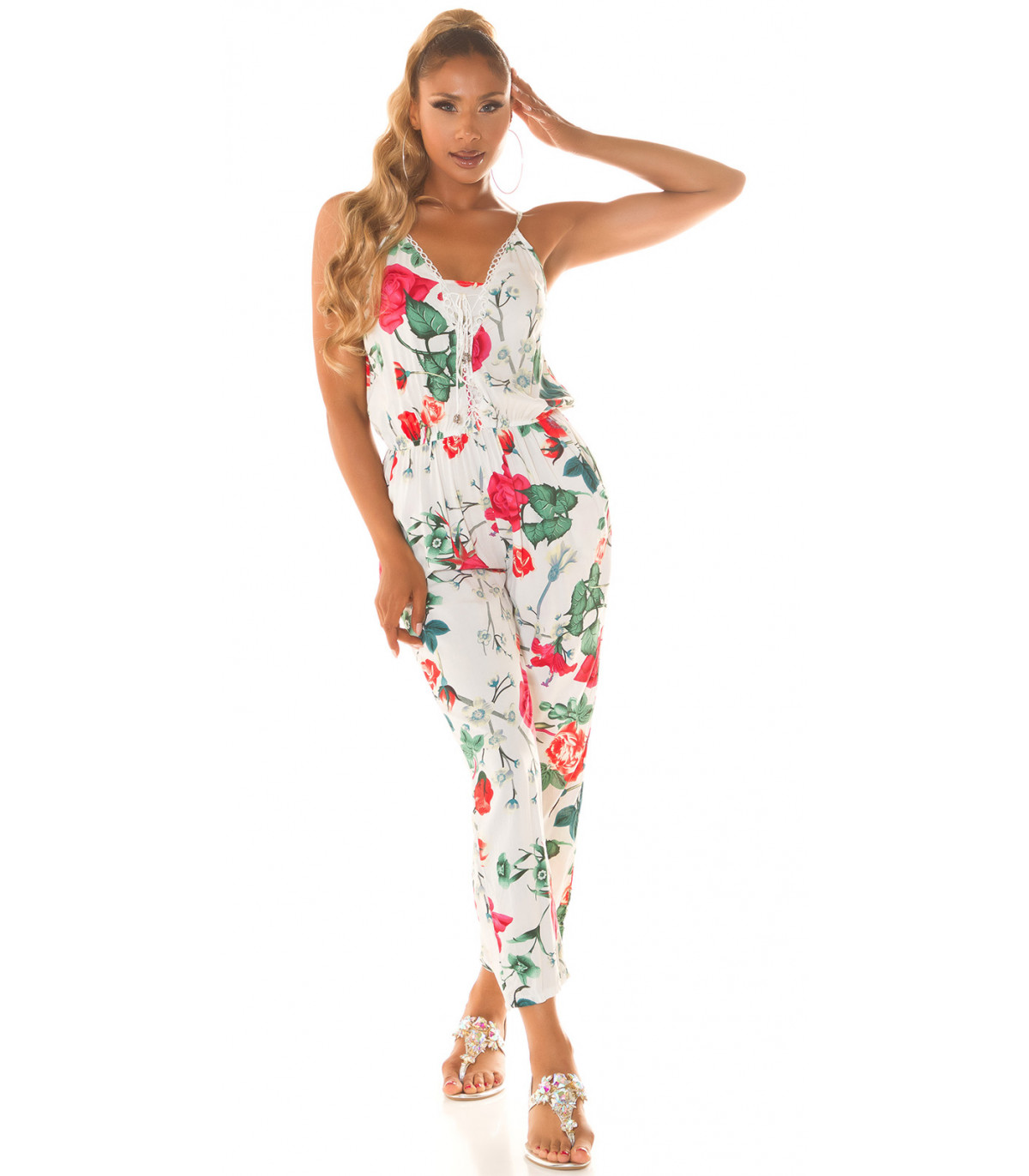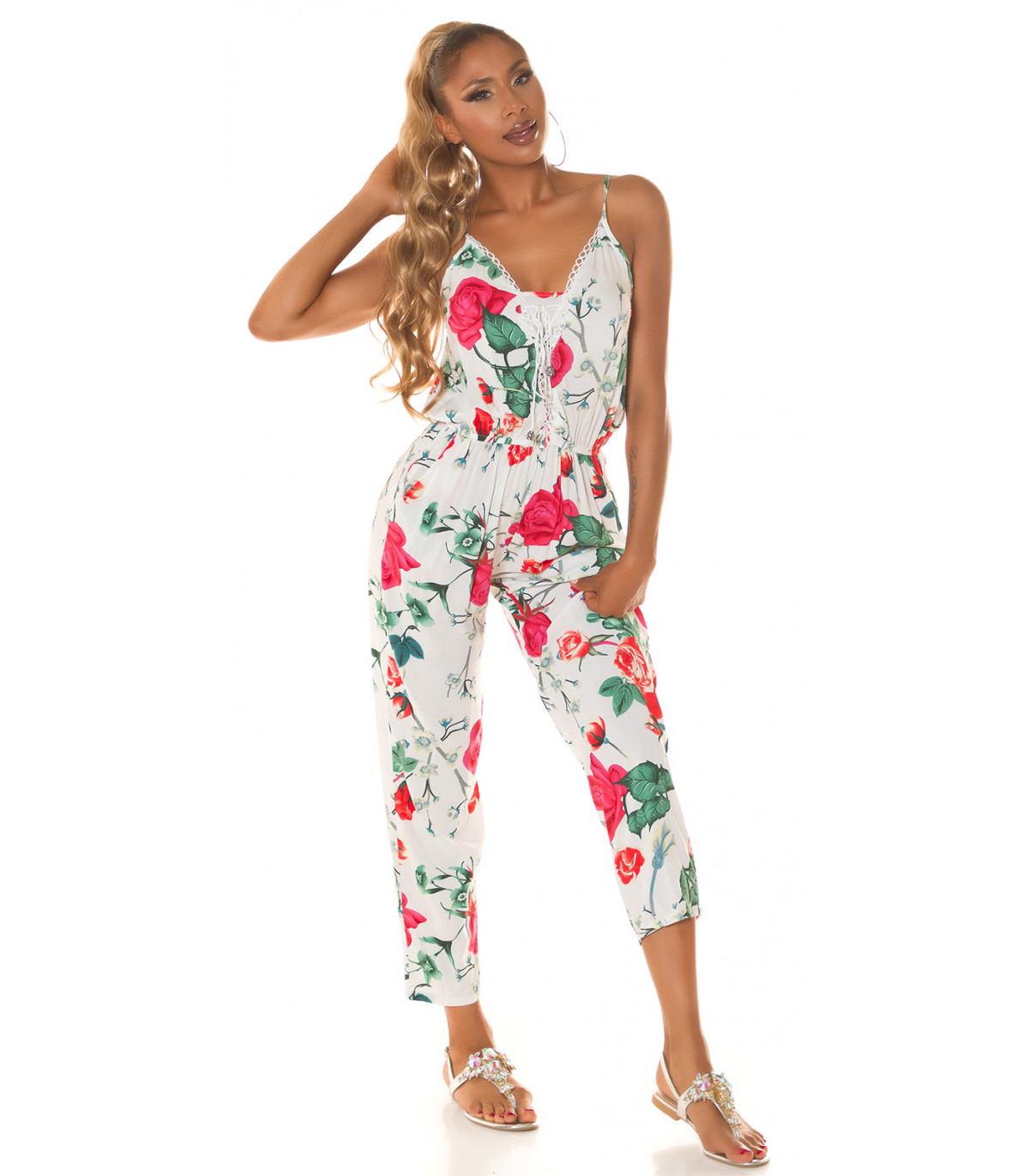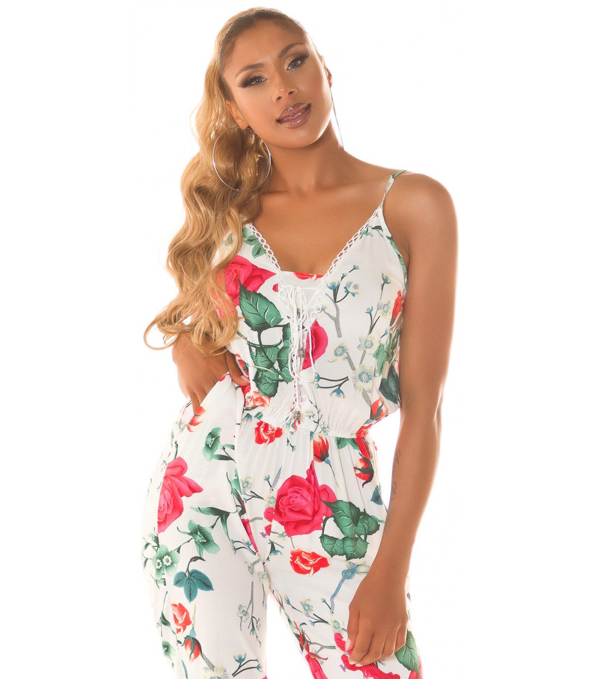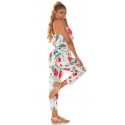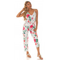 Valkoinen kukkakuvioinen jumpsuit nyörityksellä
