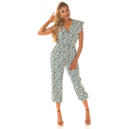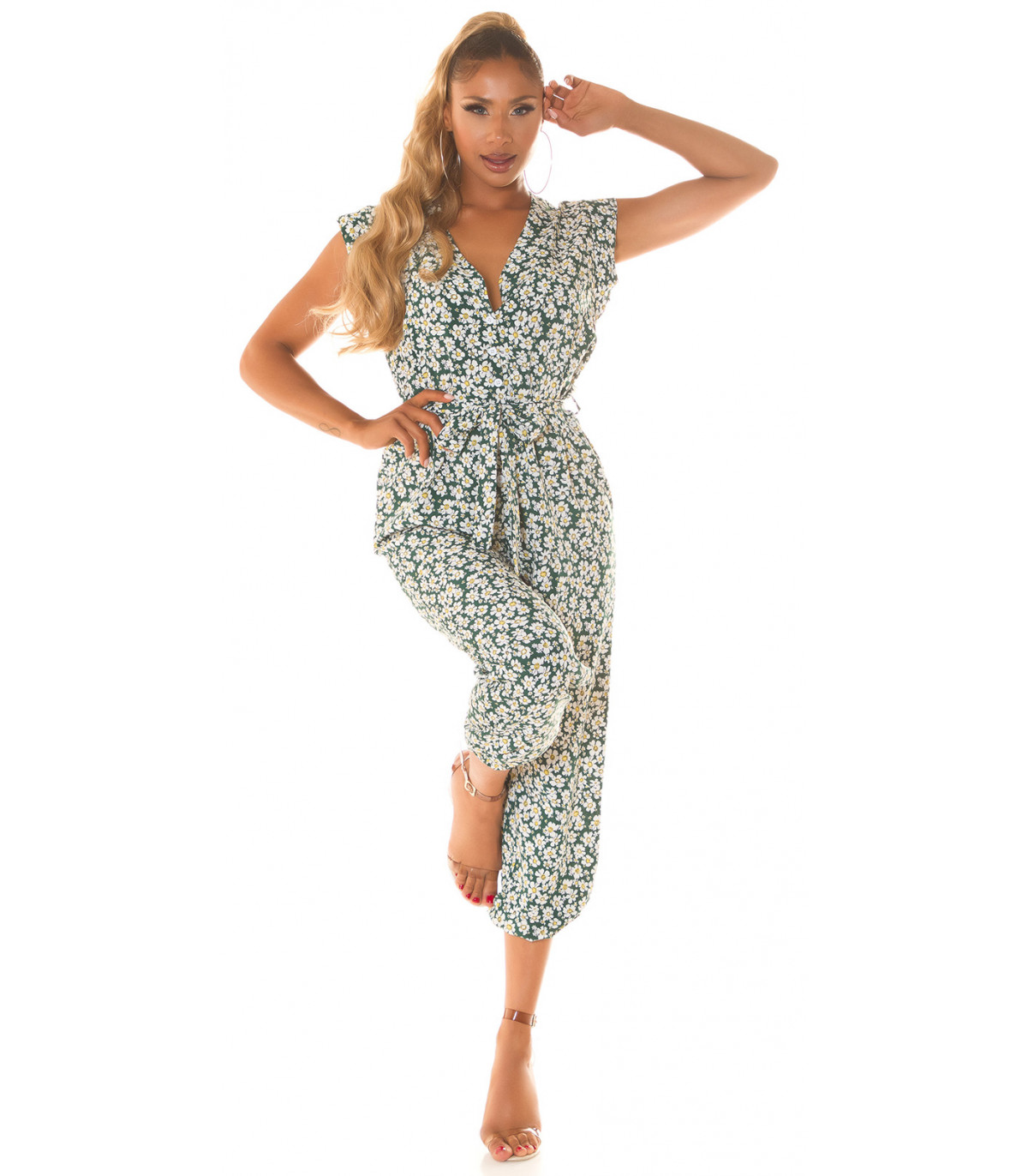 Vihreä auringonkukkakuvioinen jumpsuit vyöllä