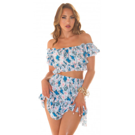Ihana kukkakuvioinen hamesetti kesään. Vaaleansininen lyhythihainen olkapäät paljastava lyhyt paita ja yhteensopiva korkeavyötäröinen röyhelöhame. Ihanan kevyt paita-hame-yhdistelmä on täydellinen kesäasu kauniisiin kesäpäiviin. Olkapäät paljastava kukkakuvioinen crop paita ja korkeavyötäröinen lyhyt hame on kesän paras treffiasu, jossa teet vaikutuksen treffikumppaniisi tyylikkään naisellisella tyylillä. Asu on ihana myös kaupungille tai piknikille - saat samalla kivasti päivetystä. Stailaa naisellinen yhdistelmäasu sandaalien, tennareiden tai avokkaiden kanssa. Kukkakuosi on kesän kaunein printti.