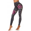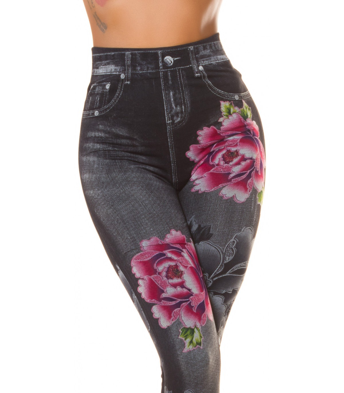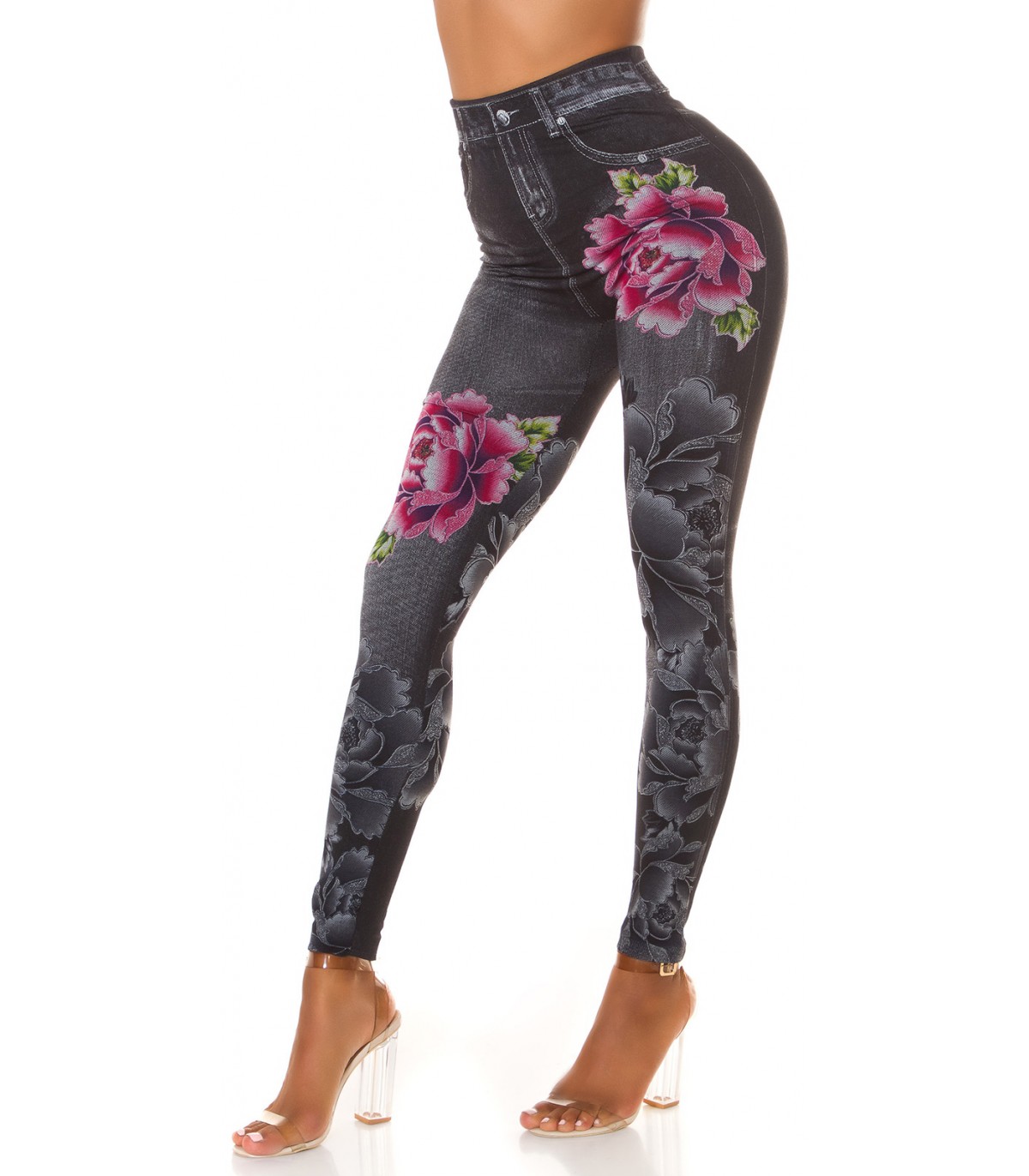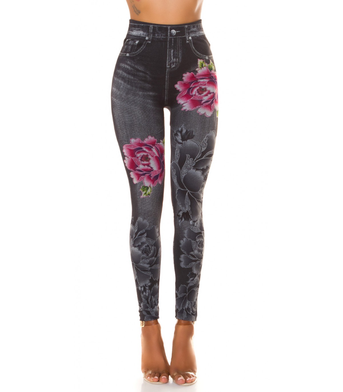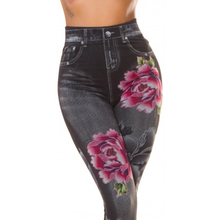 Mustat ruusukuvioiset korkeavyötäröiset farkkuleggingsit