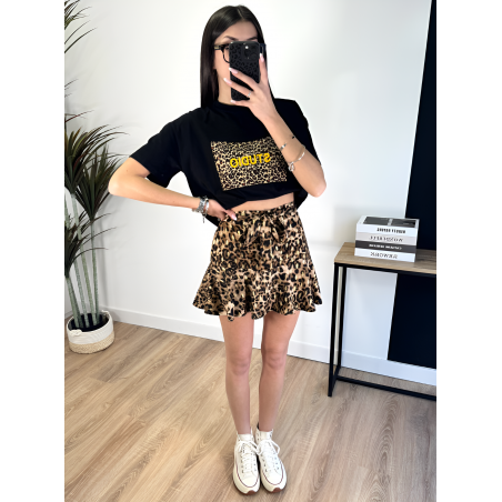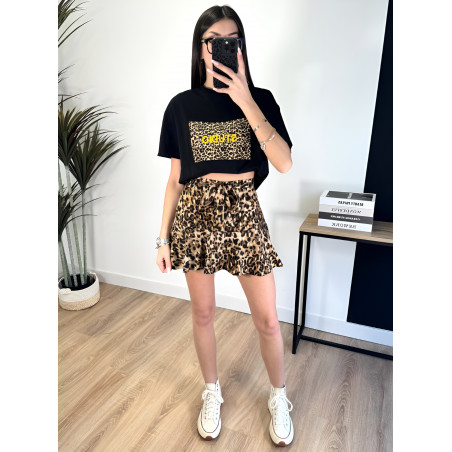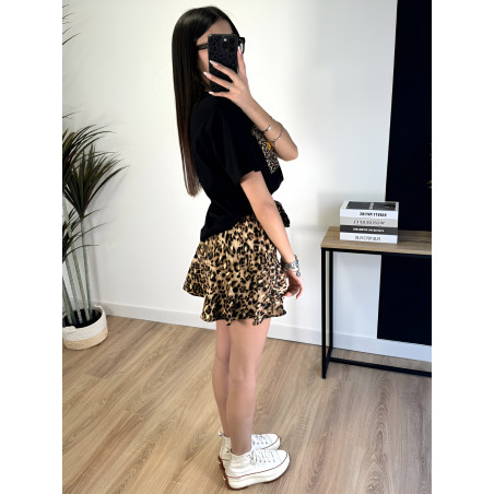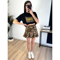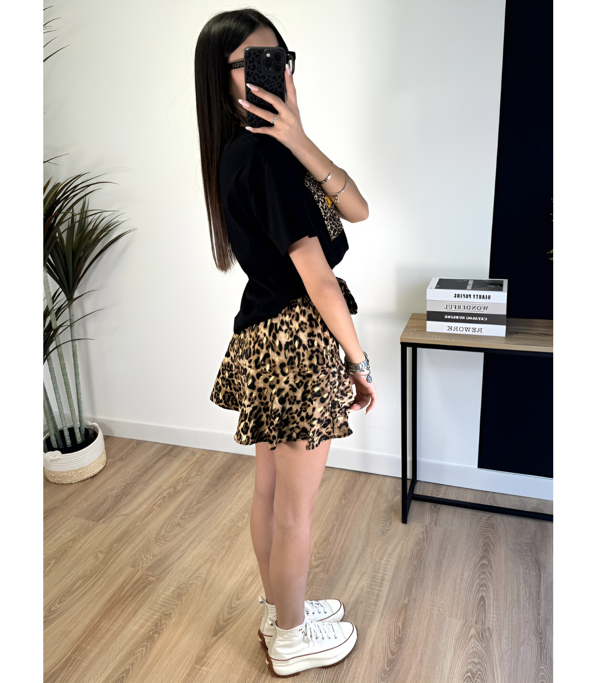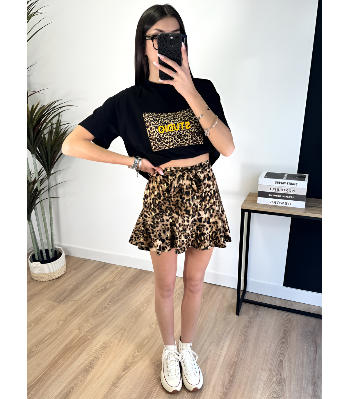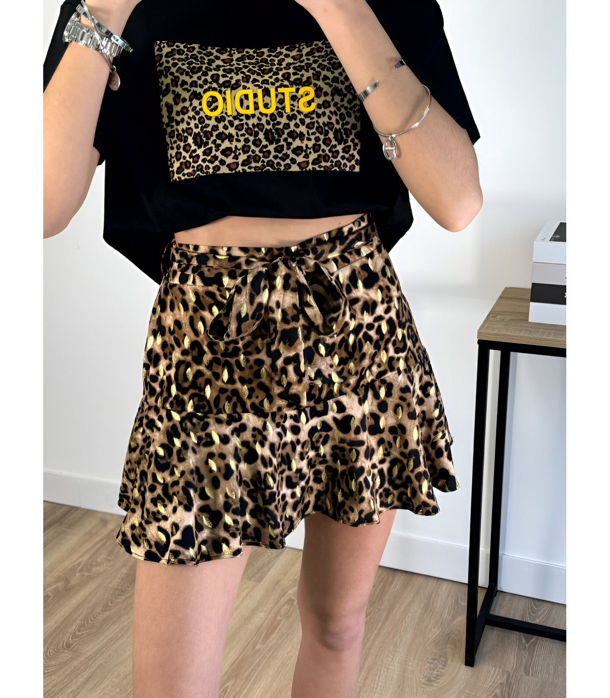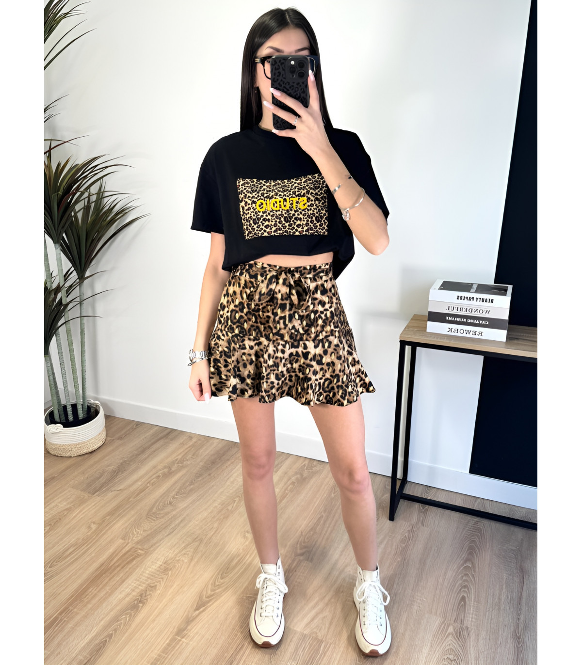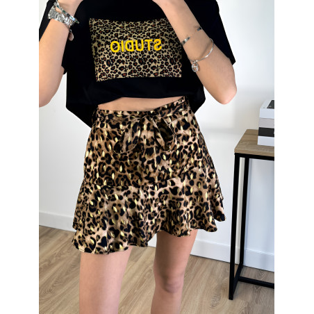 Leopardikuvioinen korkeavyötäröinen shortsihame vyöllä on täydellinen vaate osaksi naisellista asukokonaisuutta. Alusshortsit takaavat, että asu on käytännöllinen eikä sinun tarvitse huolehtia portaiden kulkemisesta tai tuulenpuuskista. Shortsien päällä oleva minihame leokuosilla takaa kuitenkin supernaisellisen tyylin.