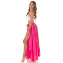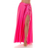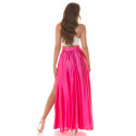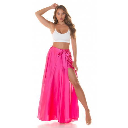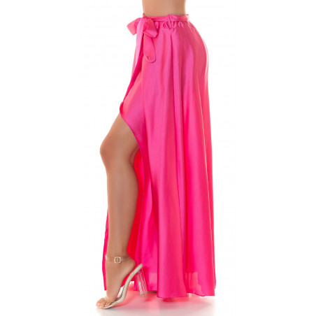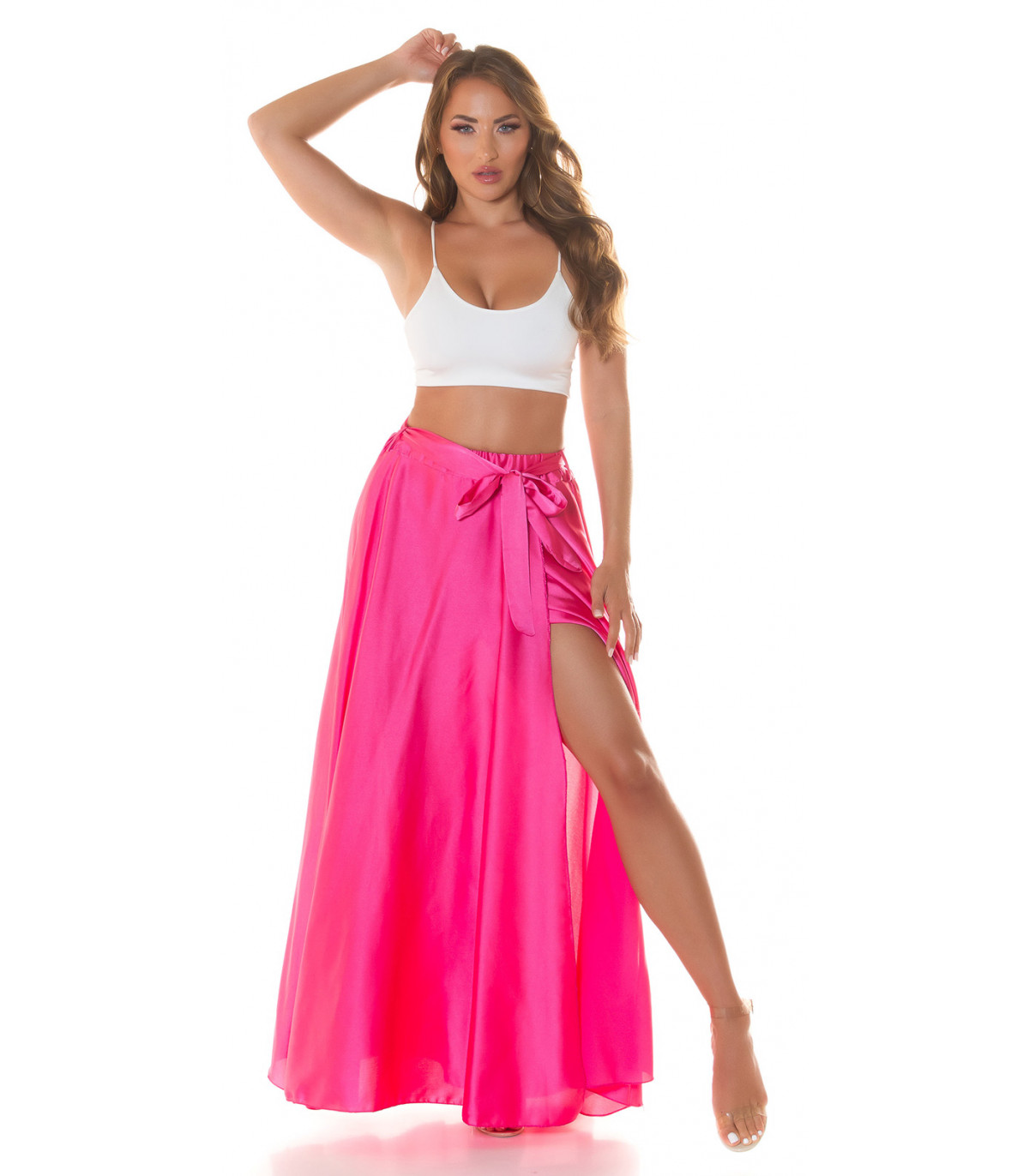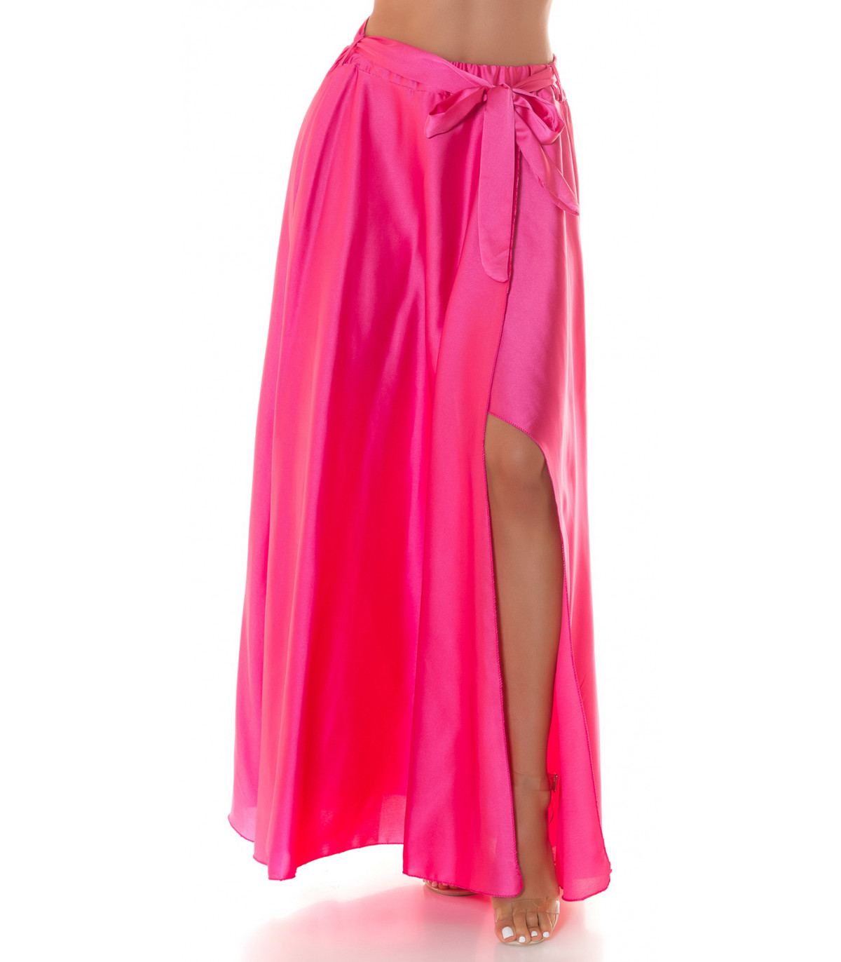 Pinkki korkeavyötäröinen satiinimaksihame halkiolla ja vyöllä. Upea pinkki pitkä satiinihame on monikäyttöinen vaate, joka sopii monenlaiseen käyttötarkoitukseen. Silkkihame on tyylikäs juhlahame, jonka ympärille on helppo stailata trendikäs juhla-asu kesän juhliin. Korkeavyötäröinen hame sopii yhteen sekä tyylikkään puseron, lyhyen topin että bodyn kanssa. Tämän hameen kanssa pusero näyttää parhaalta, kun laitat puseron helman vyötärön sisään; näin vyöllinen vyötäröosa pääsee parhaiten oikeuksiinsa, ja saat samalla tuotua naiselliset muotosi paremmin esiin. Korkea halkio tuo pitkään hameeseen ripauksen seksikkyyttä tyylikkäällä tavalla. Satiininen pitkä hame on pituudestaan huolimatta päällä kevyt, joten se sopii erinomaisesti kesän rientoihin. Halkionsa ansiosta pitkä helma liehuu viehkeästi kävellessä. Kaunis pinkki maksihame tuo väriä asuun.