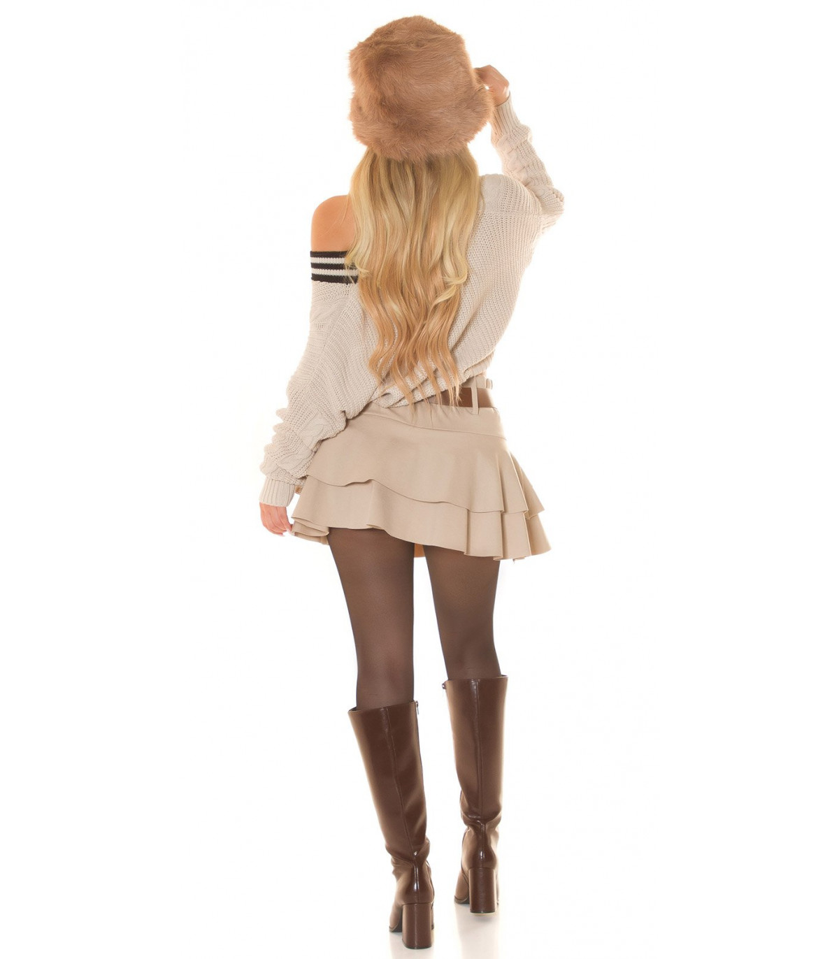Beige korkeavyötäröinen shortsihame röyhelöillä ja vyöllä on täydellinen vaate osaksi naisellista asukokonaisuutta. Yksivärinen vaate on helppo stailata osaksi erilaisia tyylejä ja se sopii yksinkertaisuutensa vuoksi loistavasti myös arkikäyttöön. Röyhelökoristeinen minihame shortseilla on kuitenkin kaukana tylsästä vaatevalinnasta. Alusshortsit takaavat, että asu on käytännöllinen eikä sinun tarvitse huolehtia portaiden kulkemisesta tai tuulenpuuskista. Päällä oleva röyhelöinen hame takaa kuitenkin supernaisellisen tyylin, jossa voit tuntea itsesi leidiksi.