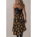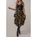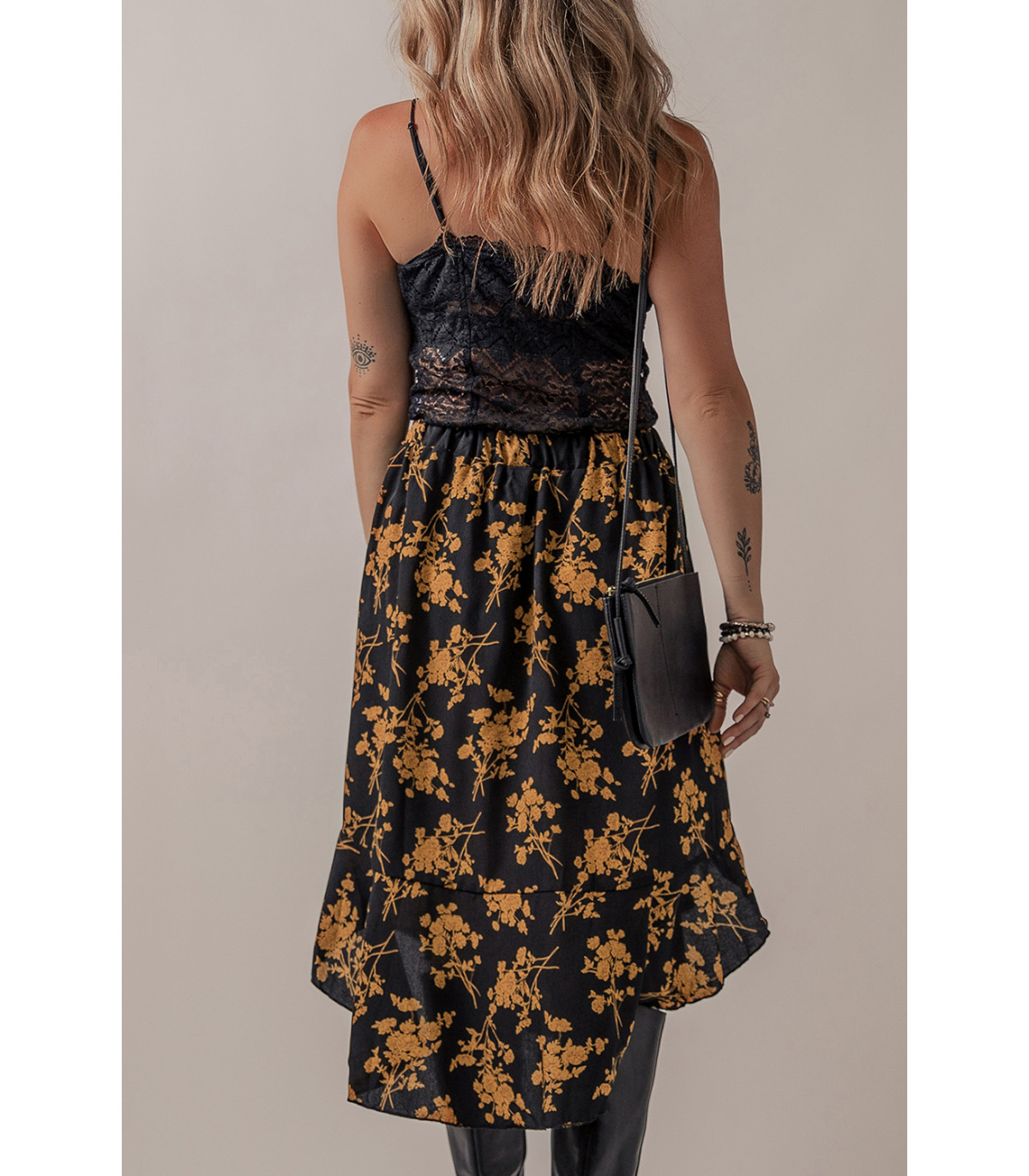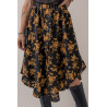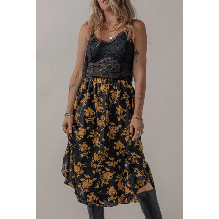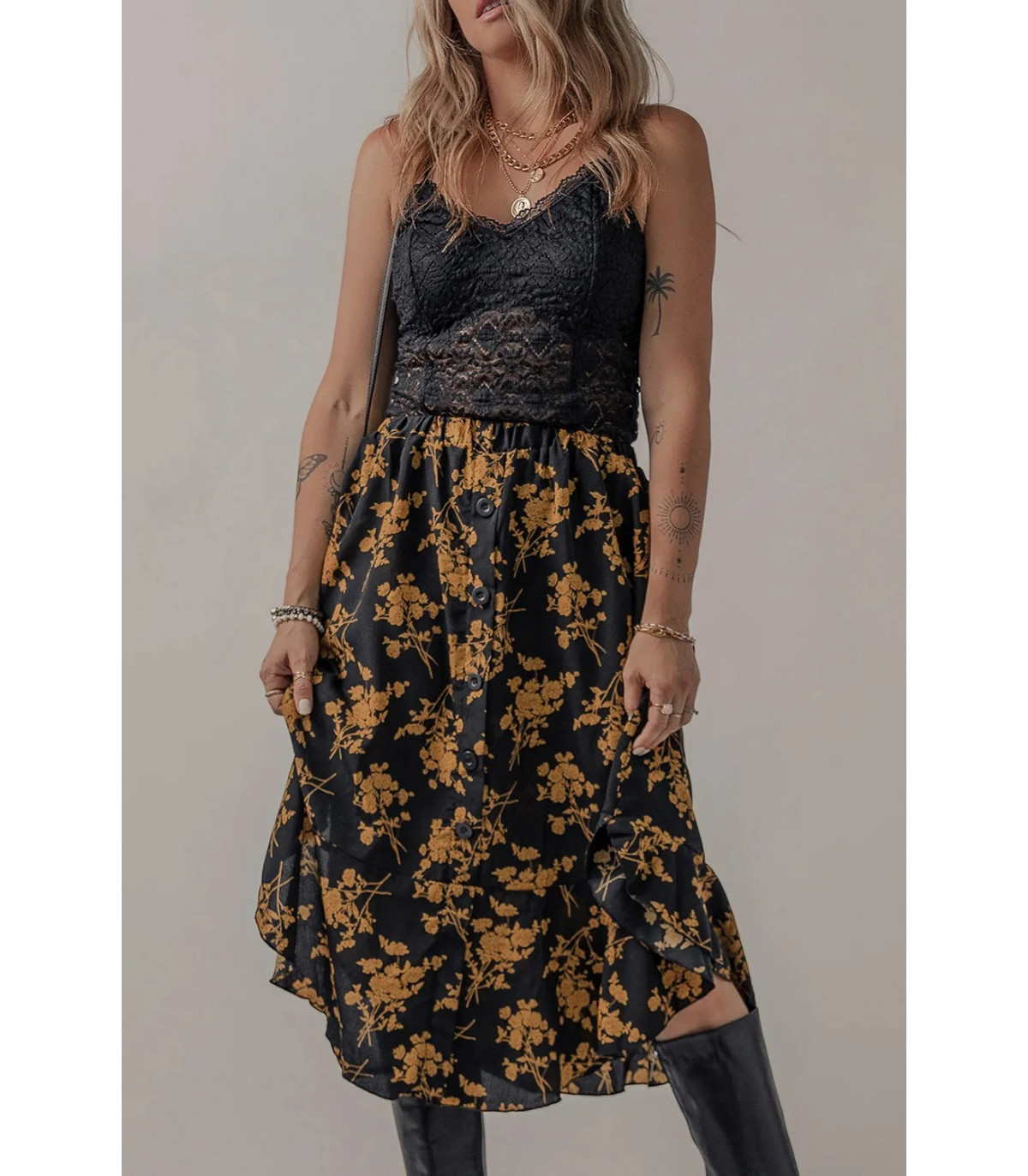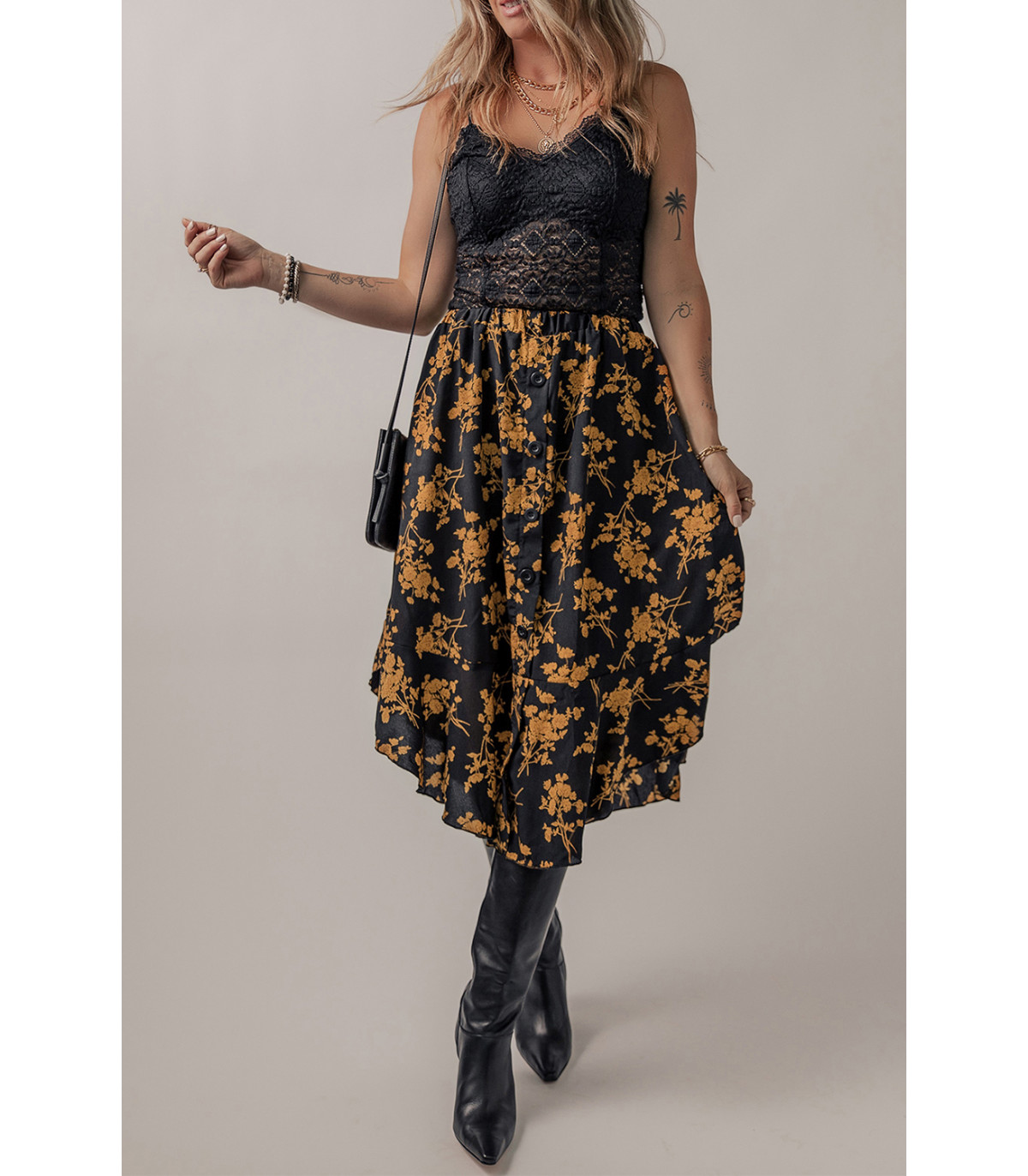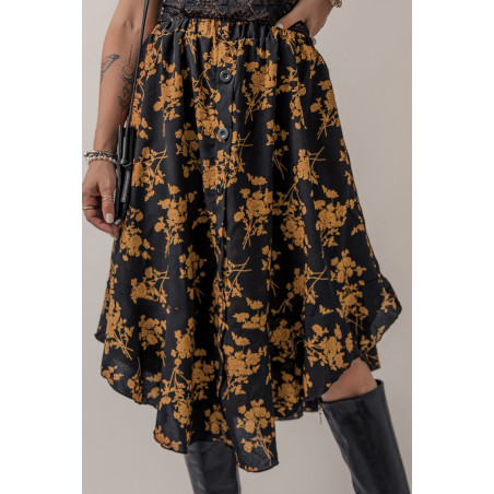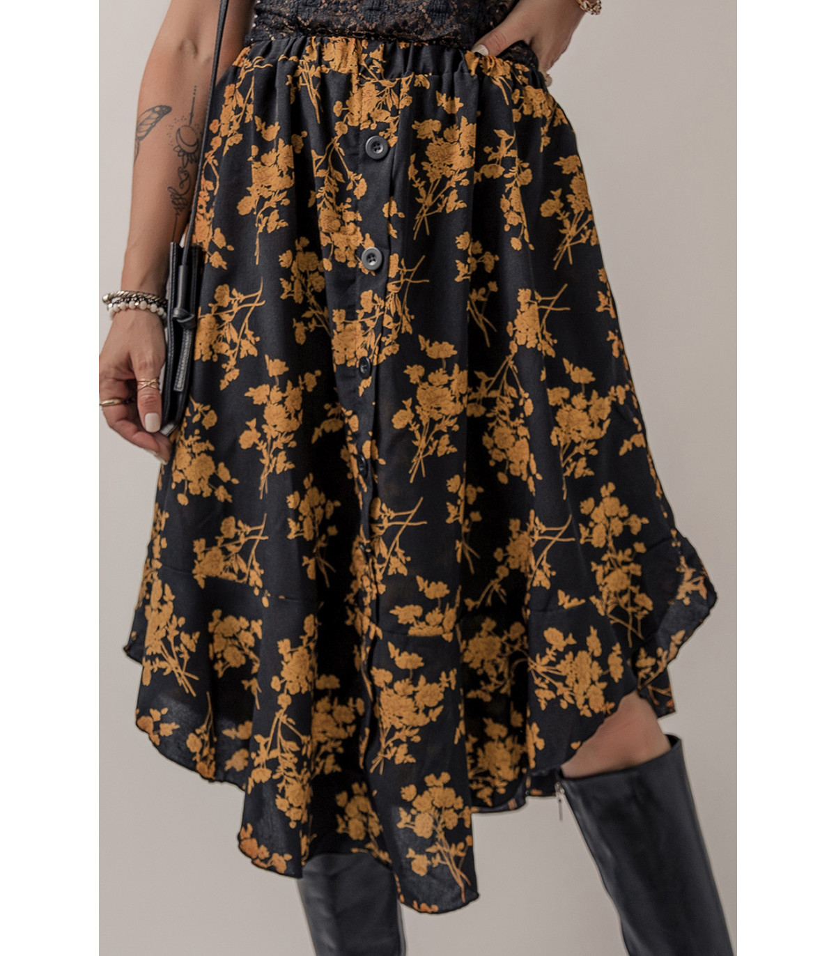 Mustaoranssi korkeavyötäröinen kukkakuvioinen hame epäsymmetrisellä helmalla ja napeilla. Vyötäröllä joustava kuminauha, muuten materiaali ei jousta. Kukkakuvioinen kesähame on ihana kesävaate, jonka ympärille voit rakentaa upeita erilaisia asukokonaisuuksia yläosaa vaihtamalla. Upea väritys, kukkakuosi ja nappikoristeet tekevät tästä hameesta näyttävän ilmestyksen. Erityisen upealta korkeavyötäröinen midihame näyttää lyhyen yläosan kanssa tai laittamalla pidemmän puseron helman vyötärön sisään piiloon.