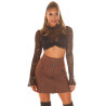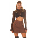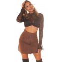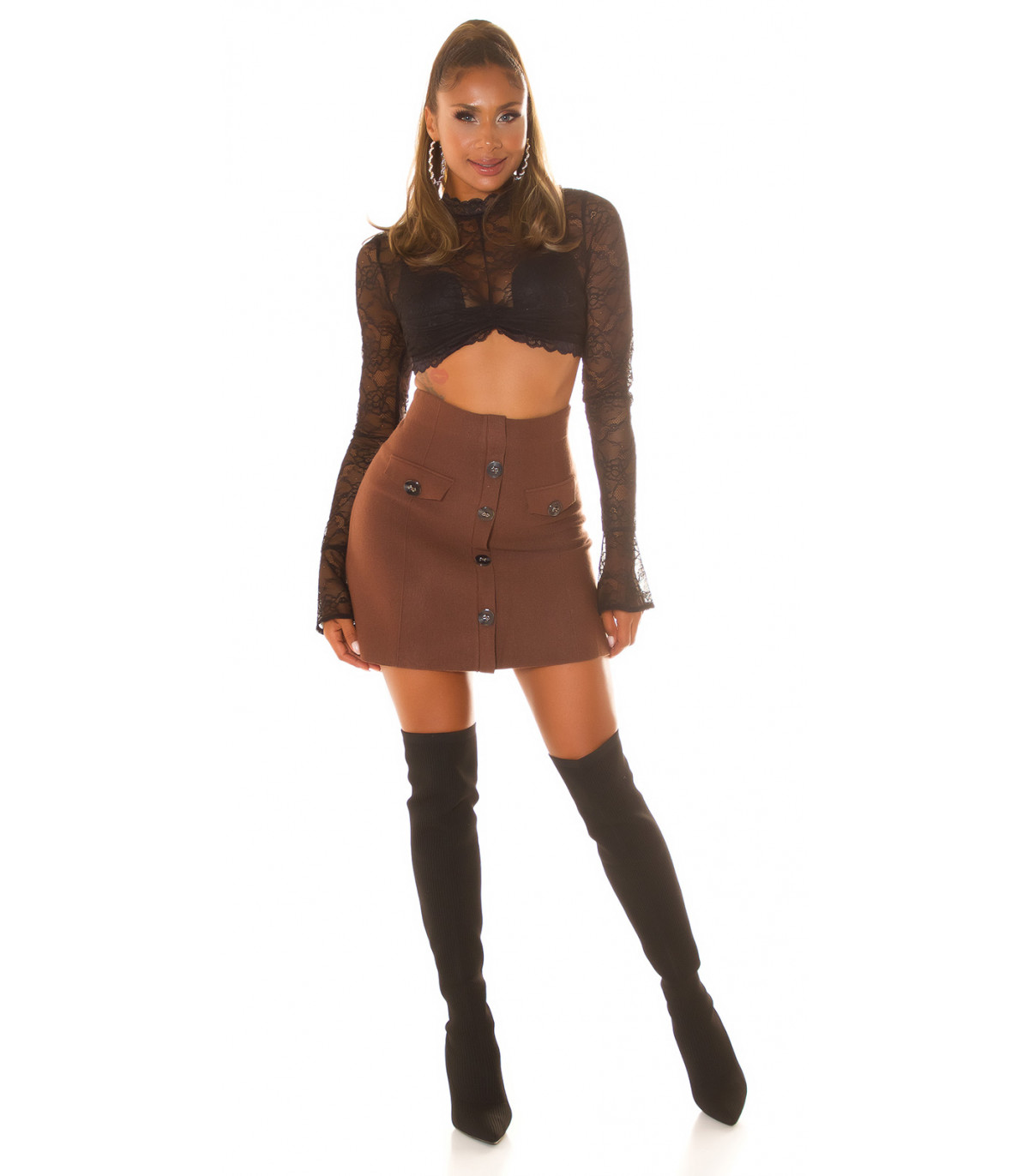 Ruskea korkeavyötäröinen hame napeilla ja koristetaskuilla. Kun haussasi on naisellinen hame, on tämä korkeavyötäröinen minihame näyttävillä yksityiskohdilla erinomainen valinta. Naisellinen korkeavyötäröinen hame näyttää erityisen upealta lyhyen yläosan tai bodyn kanssa, jotta näyttävä koristeellinen vyötäröosa pääsee parhaiten oikeuksiinsa. Laittamalla puseron tai normaalimittaisen paidan helman vyötärön helman alle piiloon, saat vyötärön esille myös pidemmän paidan kanssa.