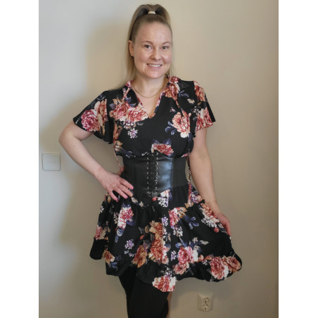 Musta lyhythihainen kukkakuvioinen mekko röyhelöillä