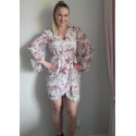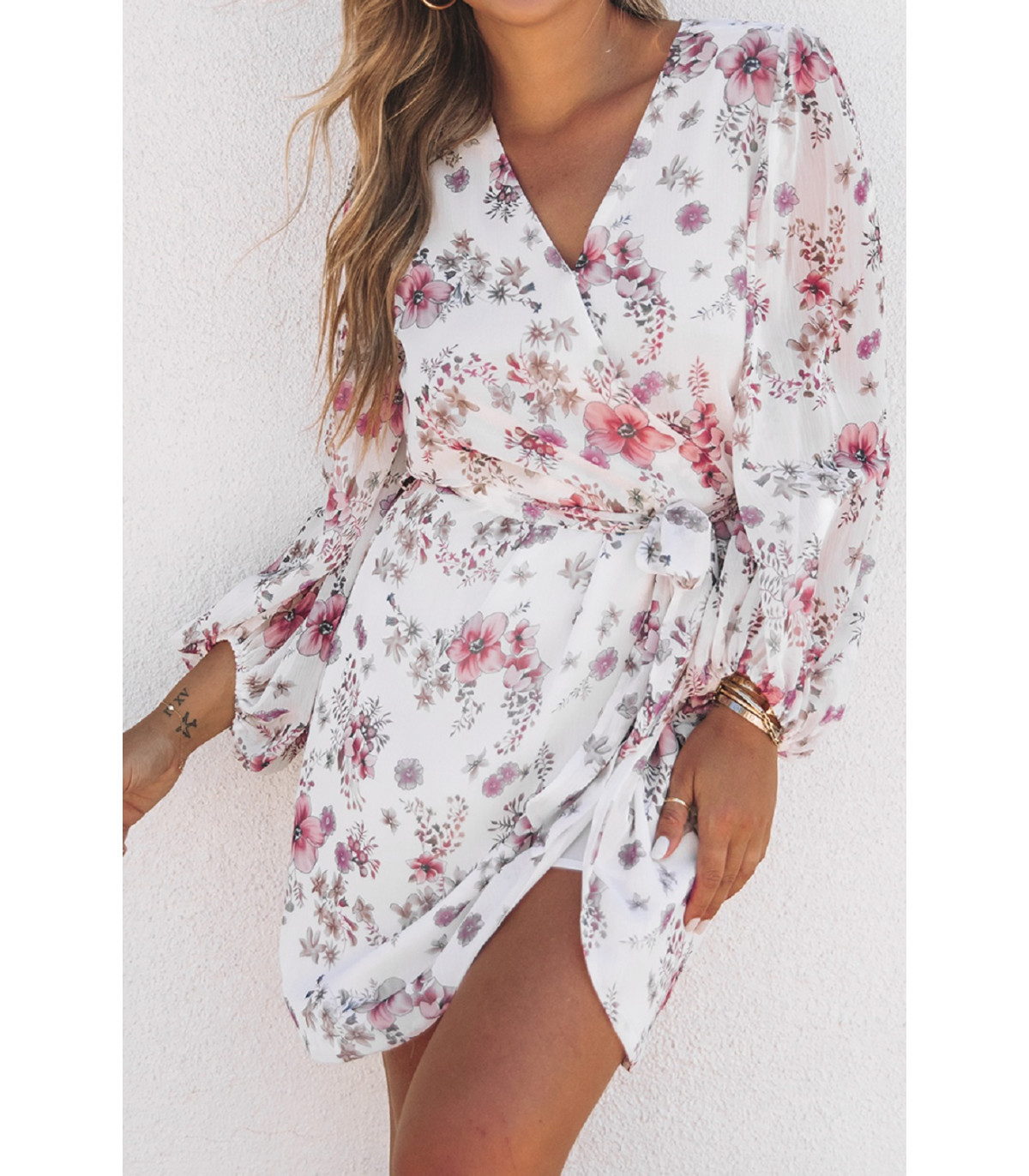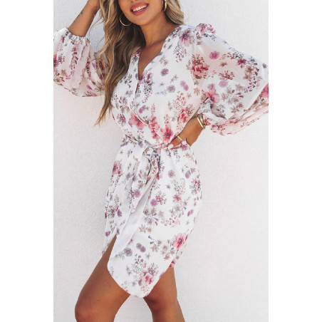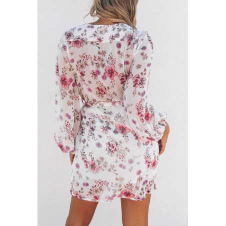 Valkoinen kukkakuvioinen wrap-look v-sifonkimekko vyöllä