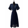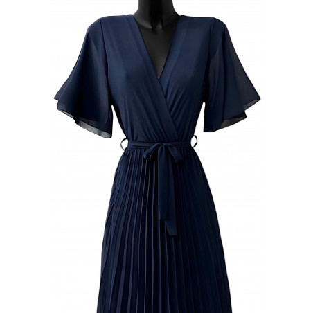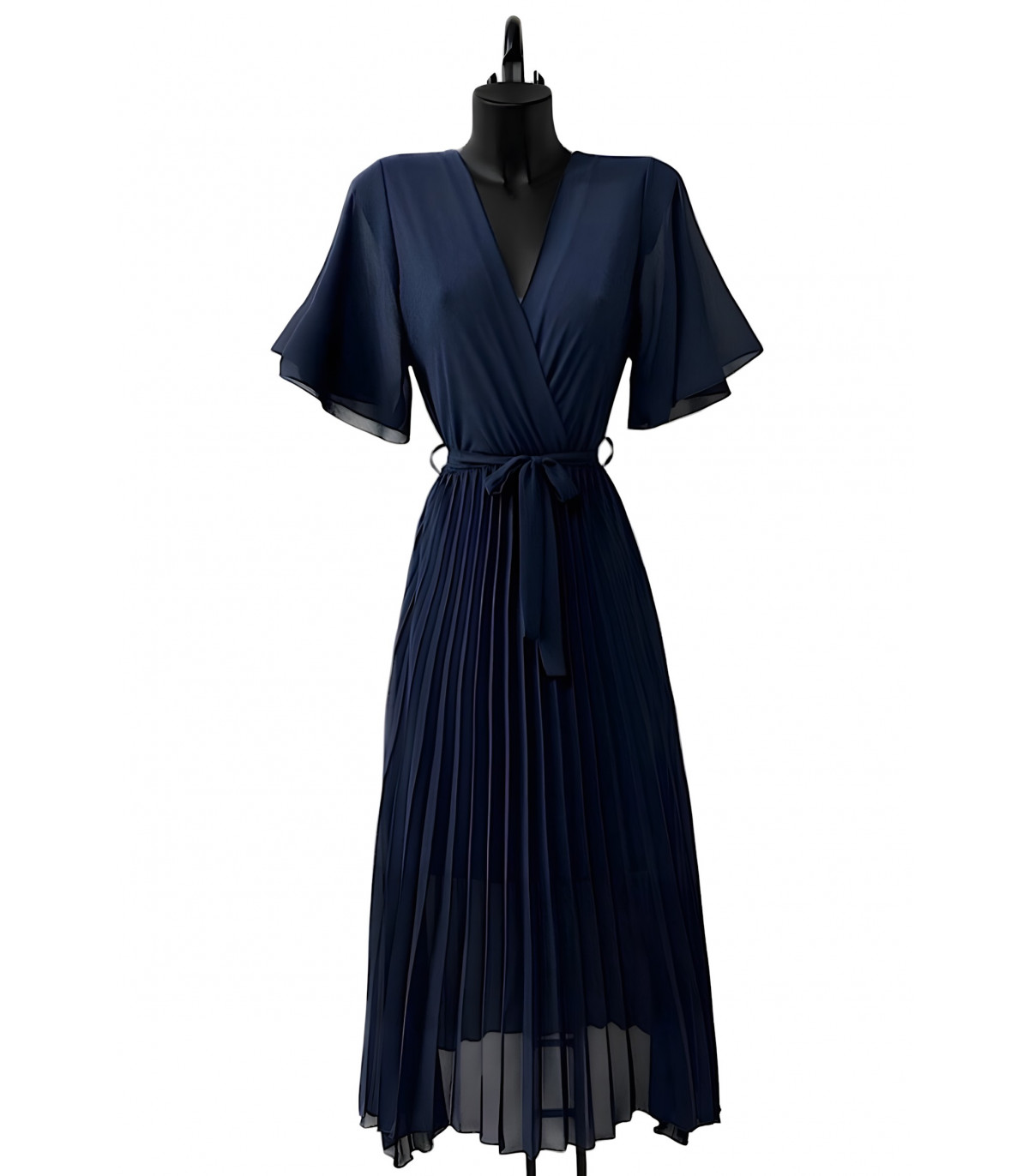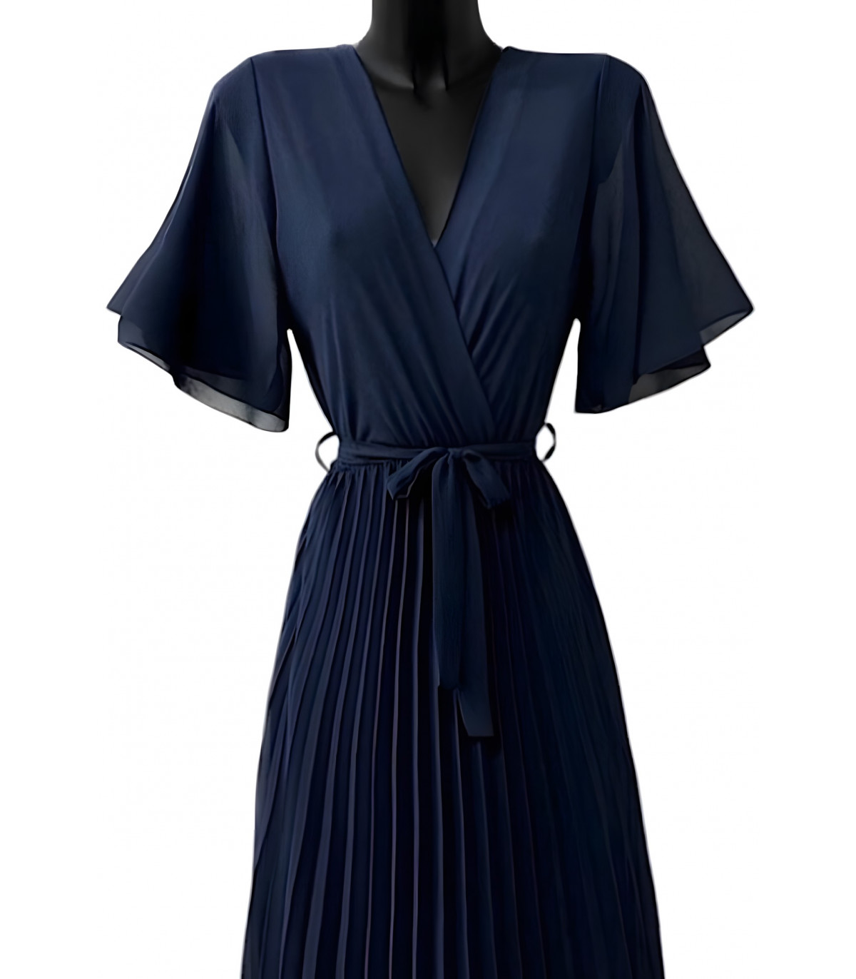 Tummansininen lyhythihainen pitkä vekkimekko vyönauhalla. Yksivärinen pitkä mekko, jossa on kauniit ilmavat lyhyet hihat ja pidempi vekkihelma, sopii erinomaisesti moneen eri tilanteeseen. Vekkimekko v-pääntiellä on erittäin naisellinen vaate, jossa voit tuntea olosi viehättäväksi. Tyylikäs mekko juhliin, treffeille ja muihin siistimpää pukeutumista vaativiin tilaisuuksiin. Tummansininen mekko on kaunis juhlamekko häihin ja muihin juhliin.