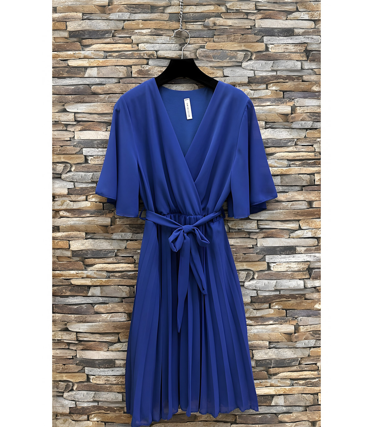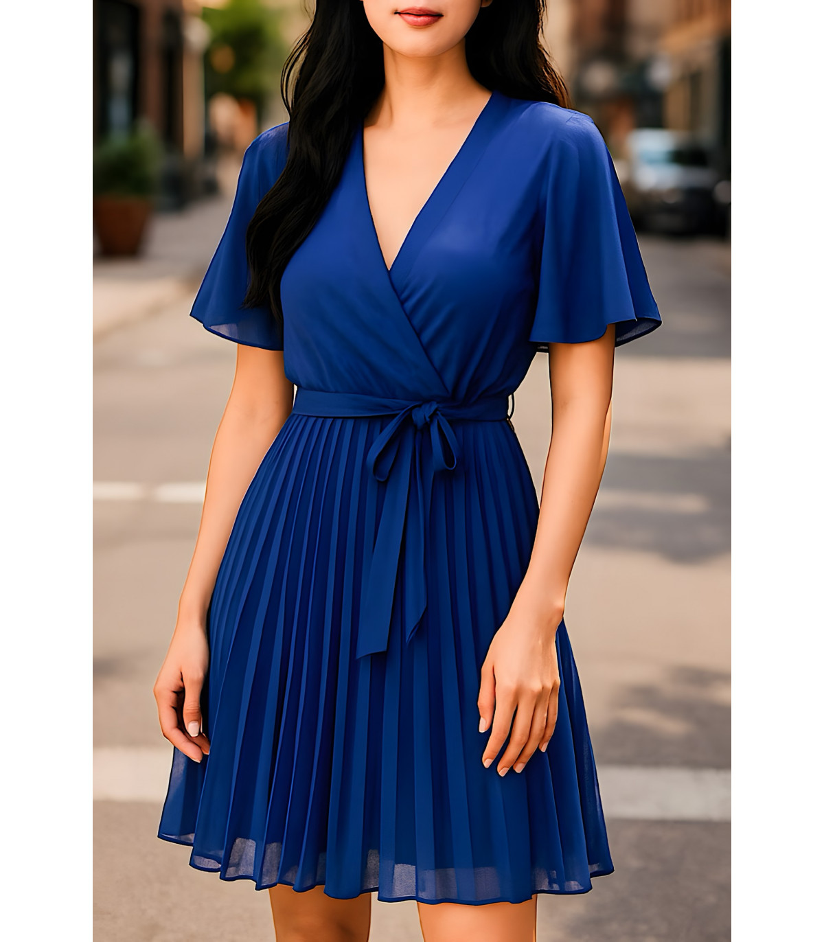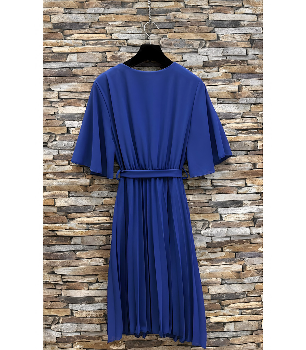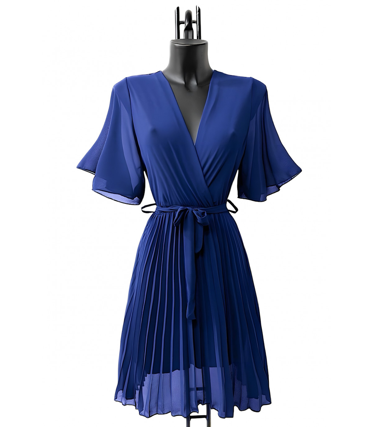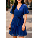 Sininen lyhythihainen vekkimekko vyönauhalla. Yksivärinen mekko, jossa on kauniit ilmavat lyhyet hihat ja vekkihelma, sopii erinomaisesti moneen eri tilanteeseen. Vekkimekko v-pääntiellä on erittäin naisellinen vaate, jossa voit tuntea olosi viehättäväksi. Tyylikäs mekko juhliin, treffeille ja muihin siistimpää pukeutumista vaativiin tilaisuuksiin. Kaunis sininen juhlamekko häihin ja muihin juhliin.
