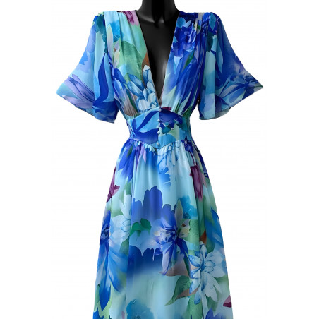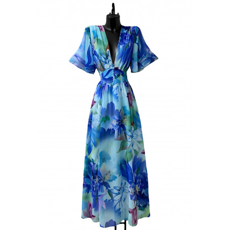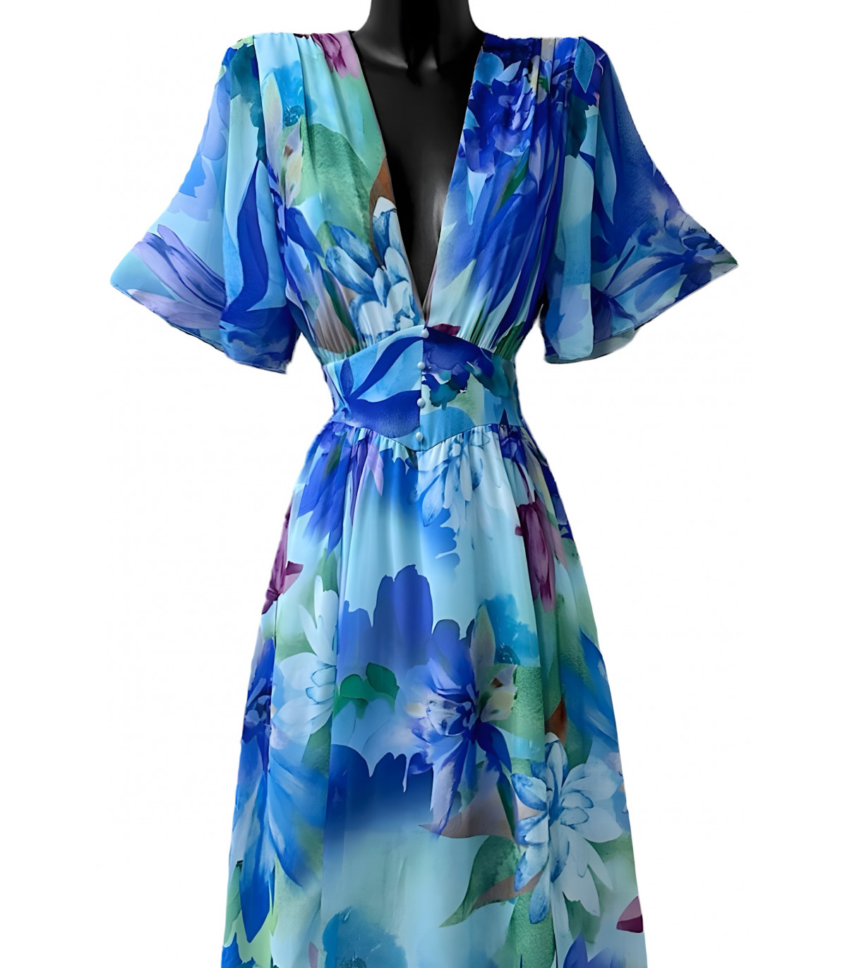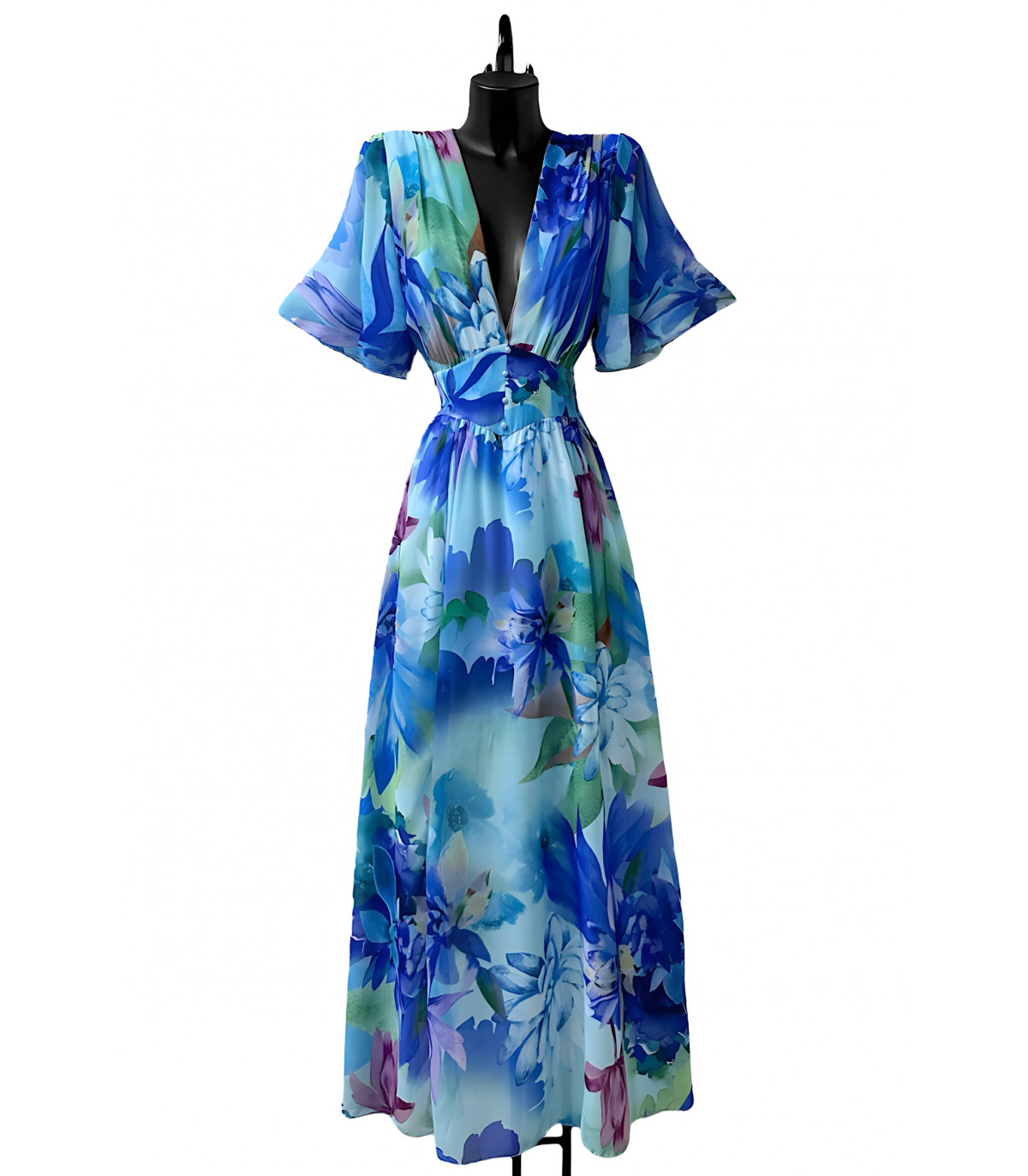Elle Style Juliana sininen kukkakuvioinen pitkä mekko helminapeilla