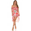 Punainen ruusukuvioinen off-shoulder high low -mekko ketjuvyöllä