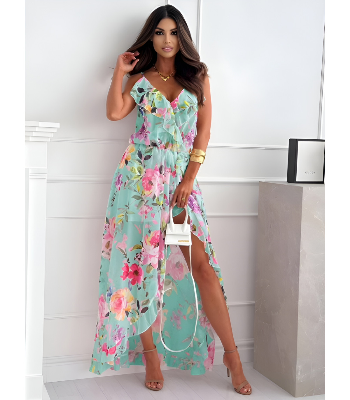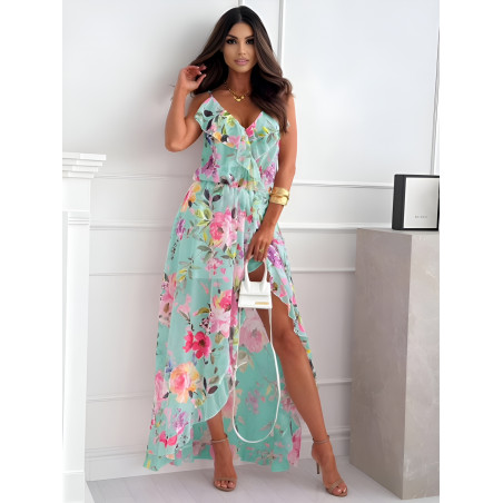 Upea kukkakuvioinen takaa pidempi sifonkimekko v-pääntiellä on täydellinen treffimekko ja tyylikäs juhlamekko erilaisiin tilanteisiin. Rosy Days:n minttu kukkamekko on tyylikäs ja monikäyttöinen valinta naiselle, joka arvostaa ajatonta eleganssia ja modernia muotia. High low -helma tuo mekkoon mielenkiintoisen ja modernin ilmeen, tehden siitä täydellisen niin kesään kuin erilaisiin juhliin.