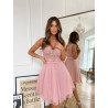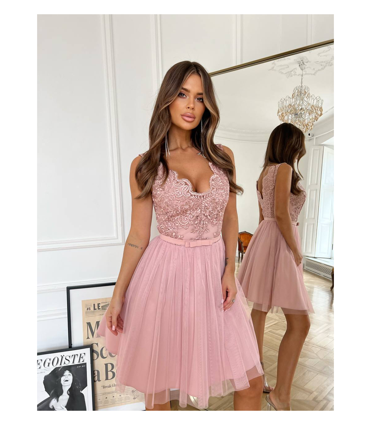 Upea lyhyt vaaleanpunainen juhlamekko kauniilla yksityiskohdilla. Selkäpuolella oleva piilovetoketju helpottaa päälle pukemista. Tämä mitä kaunein juhlamekko pitsikirjailulla yläosalla ja tyllihelmalla erottuu edukseen joukosta. Vyötäröllä kaunis vyökoriste somistaa vyötärön seutua. Naisellinen juhlamekko v-pääntiellä imartelee naisellisia muotojasi tyylikkäällä tavalla. Tyttömäinen tyllihelma viimeistelee täydellisen kokonaisuuden. Kun etsinnässäsi on kaunis juhlamekko häihin, valmistujaisiin ja muihin juhliin, on tämä hempeä mekko täydellinen valinta. Laittamalla jalkaan sirot korkokengät tai söpöt ballerinat ihastuttava juhlalook on valmis. Nappaa halutessasi mukaan harteiden peitoksi esimerkiksi kaunis juhlahuivi tai neuletakki. Siro käsilaukku viimeistelee juhlatyylin. Laadukas juhlamekko on valmistettu EU:ssa.