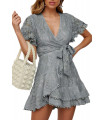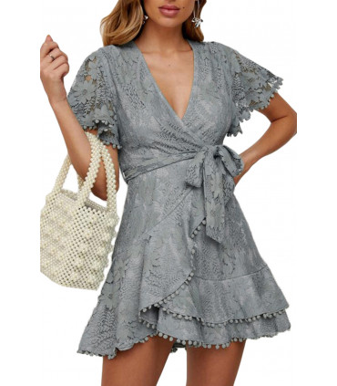 Harmaa pitsinen wrap-look v-mekko vyöllä