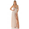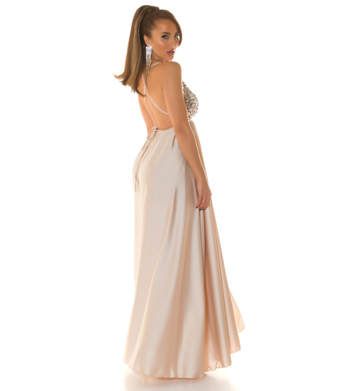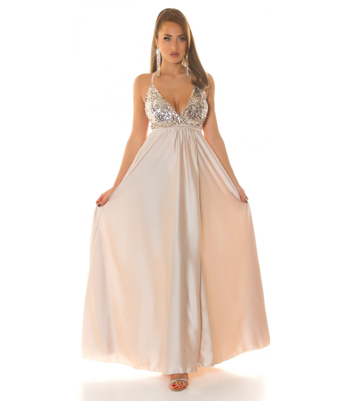 Koucla beige pitkä satiinilook v-juhlamekko paljeteilla