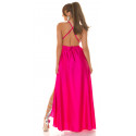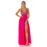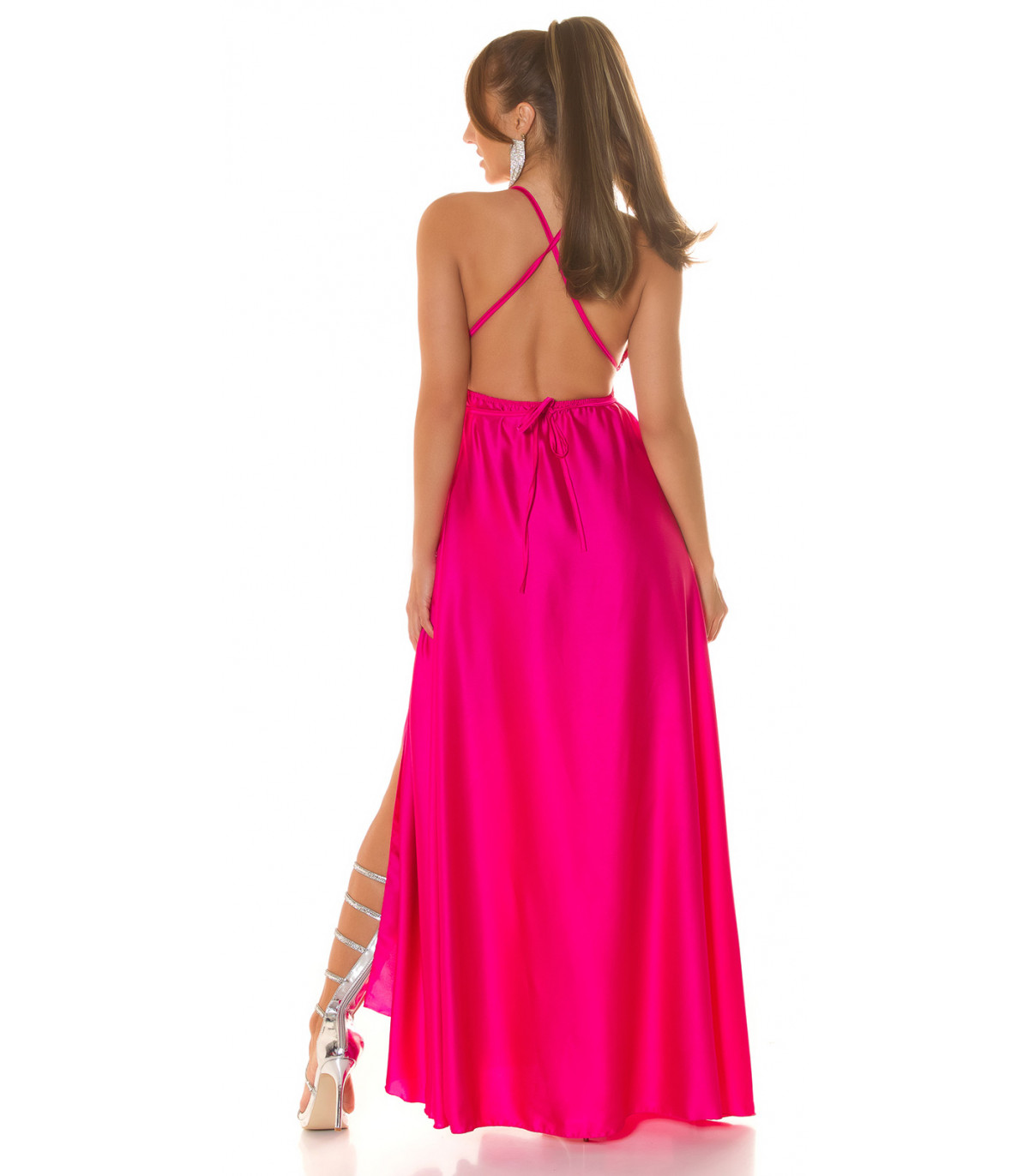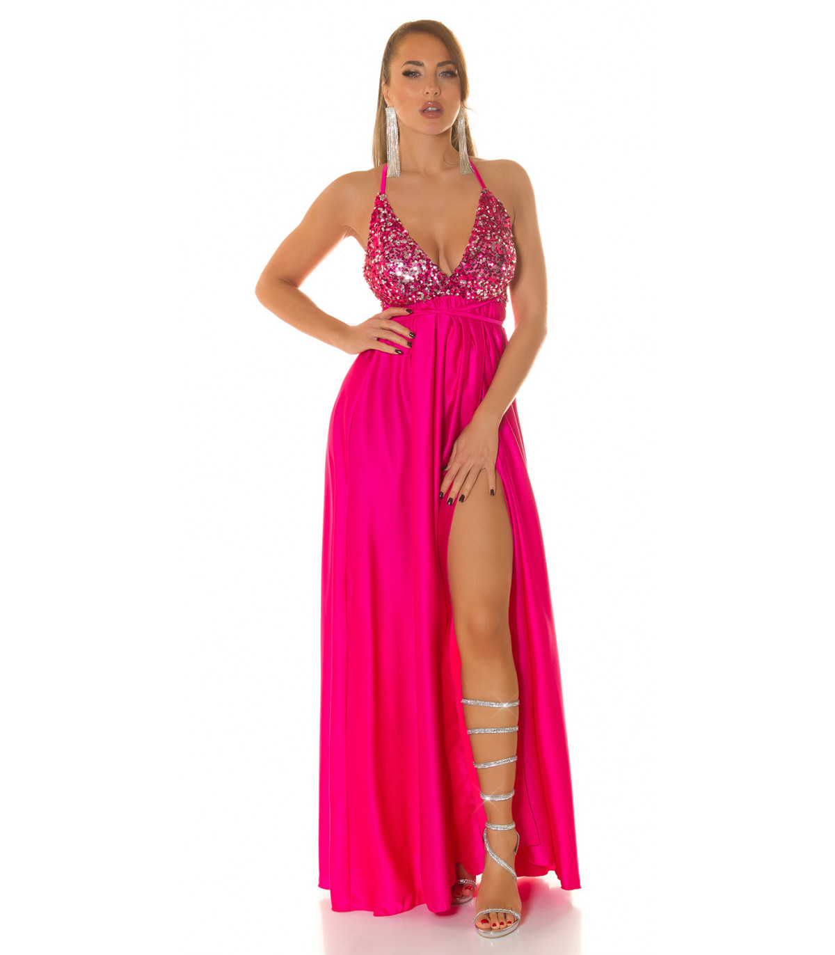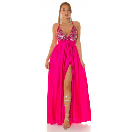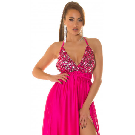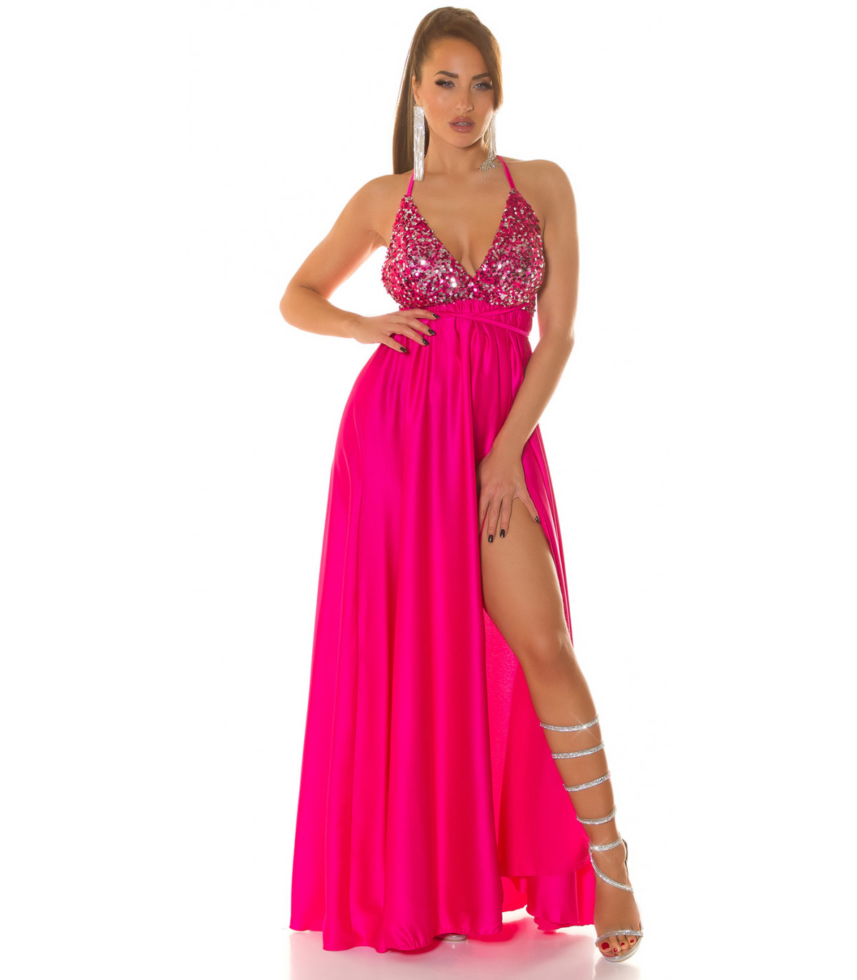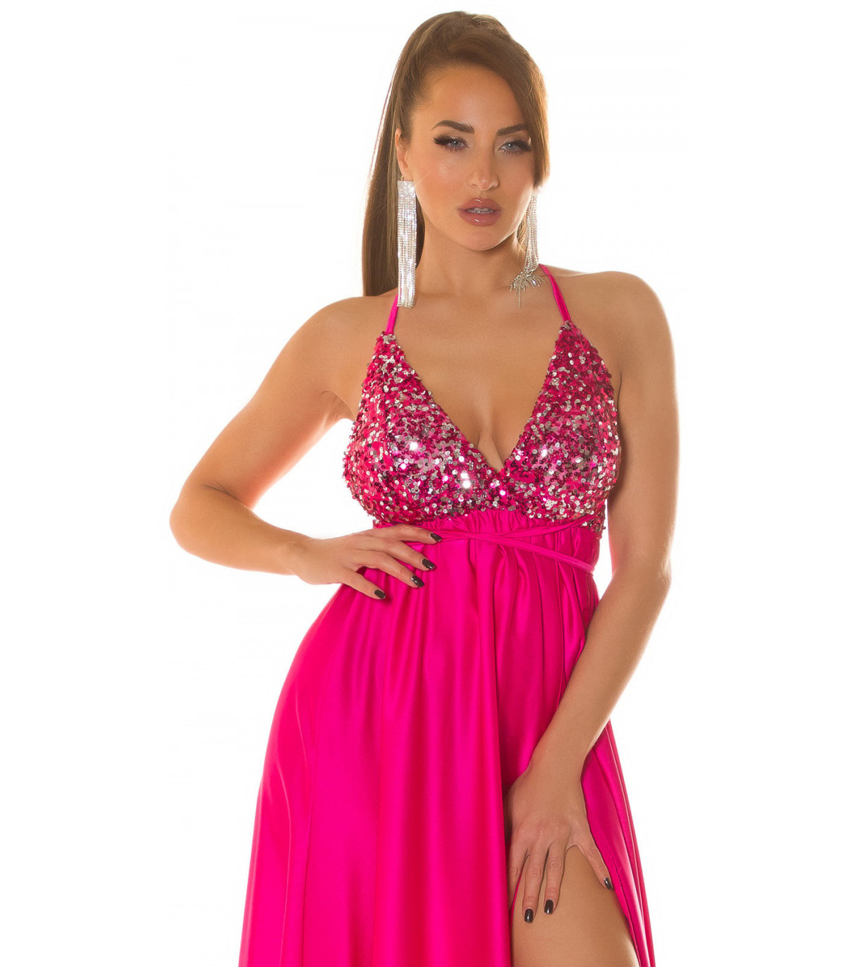 Koucla pinkki pitkä satiinilook v-juhlamekko paljeteilla