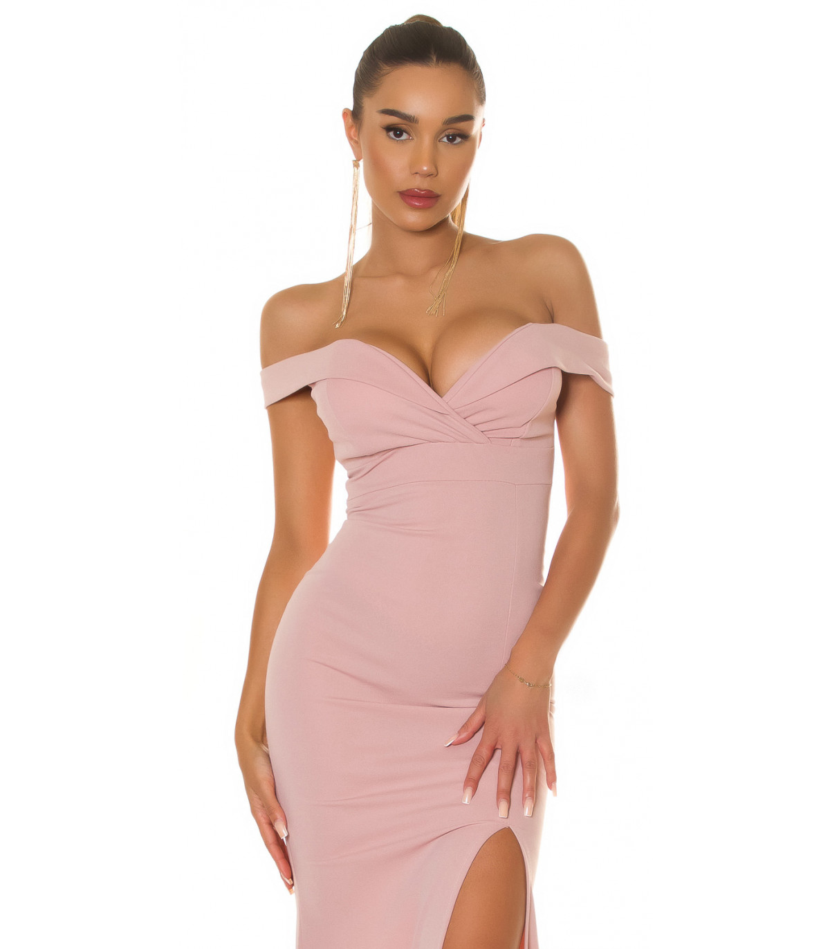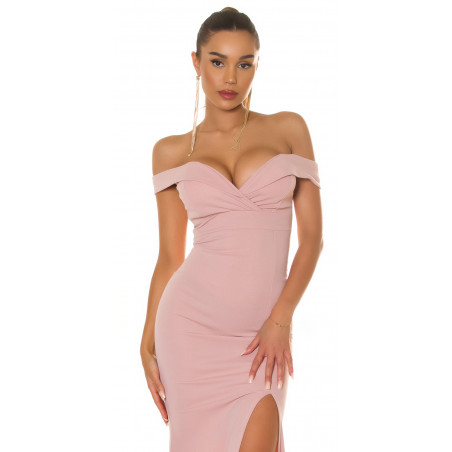 Koucla vaaleanpunainen off-shoulder pitkä juhlamekko halkiolla