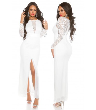 Valkoinen pitkähihainen pitsikoristeinen pitkä juhlamekko halkiolla. Upea valkoinen juhlamekko näyttävillä yksityiskohdilla erottuu edukseen massasta.