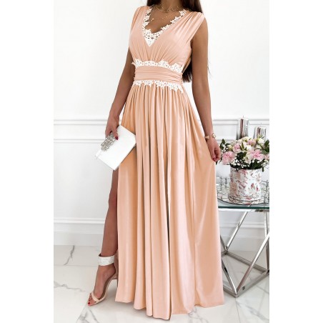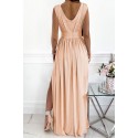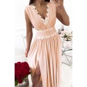 Vaaleanpunainen koristekirjailtu pitkä v-juhlamekko