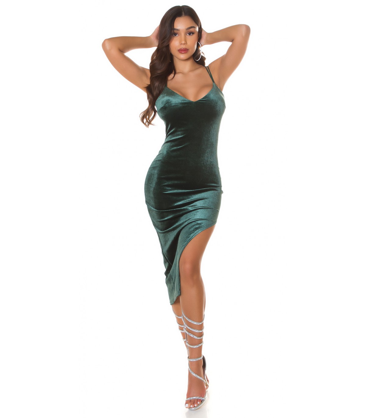 Vihreä samettilook v-mekko halkiolla. Upea midimittainen vihreä samettimekko on täydellinen treffimekko, jossa voit tuntea olosi itsevarmaksi ja upeaksi. Samettinen bodycon mekko sopii loistavasti moneen eri tilanteeseen, kuten teatteriin, hienoille illallisille ja uudenvuodenjuhliin. Kun haussasi on katseet kääntävä mekko pikkujouluihin tai joulunpyhille, on tämä erinomainen valinta. Korkokengät täydentää naisellisen lookin. Lisää harteille halutessasi neuletakki, bolero tai huivi.