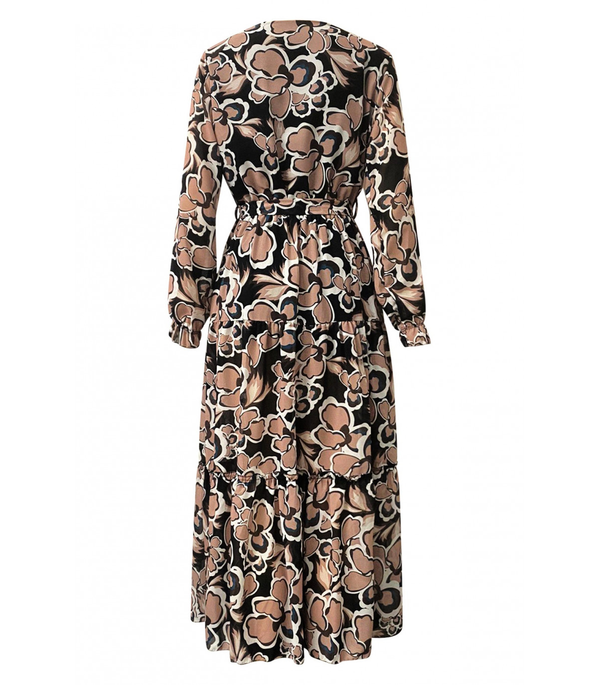 Ruskea kuviollinen pitkähihainen v-sifonkimaksimekko vyöllä. Mekon alla lyhyempi alusmekko, hihat ja helmaosa ovat läpinäkyviä. Vyötäröllä joustava kuminauha. Valmistettu Euroopassa.