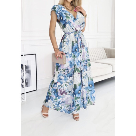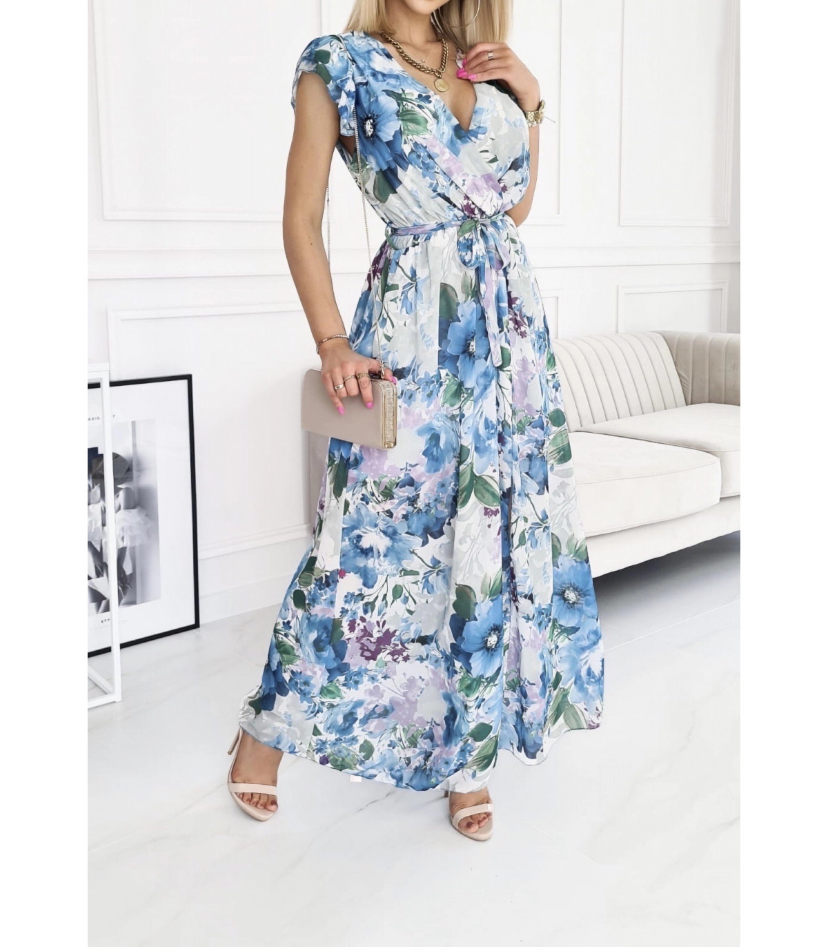 EB sininen kukkakuvioinen v-maksimekko vyöllä