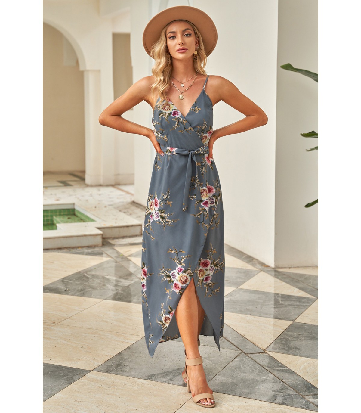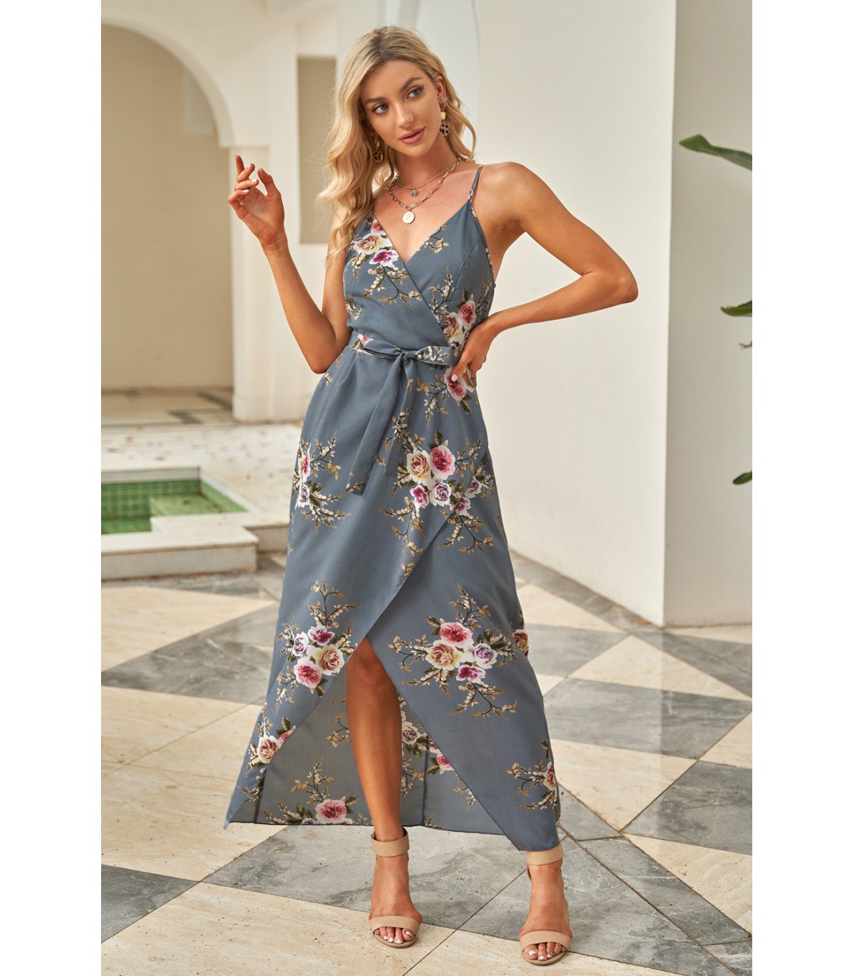 Harmaa kukkakuvioinen wrap-look v-maksimekko [LÖYTÖ]