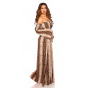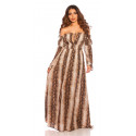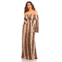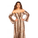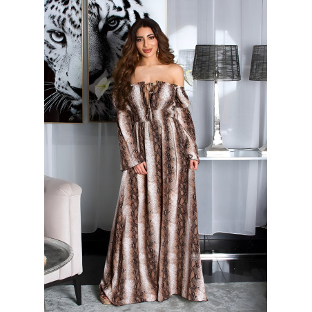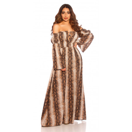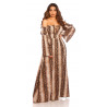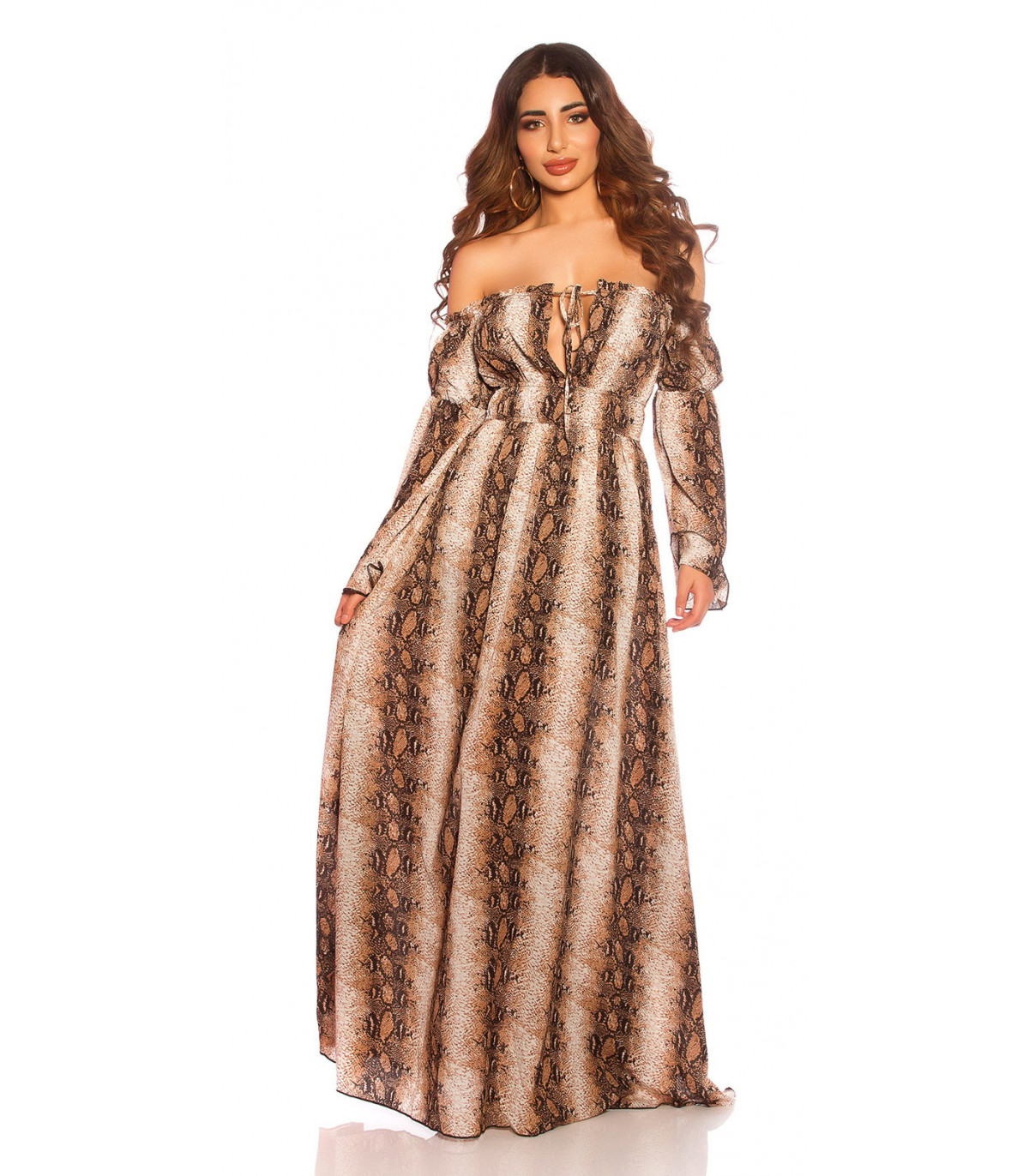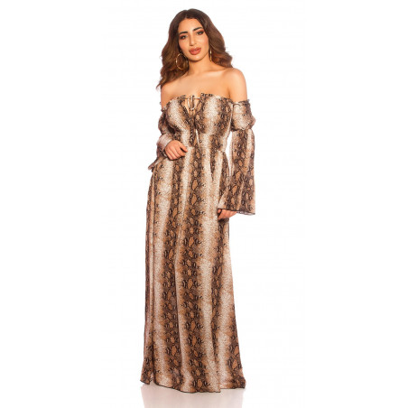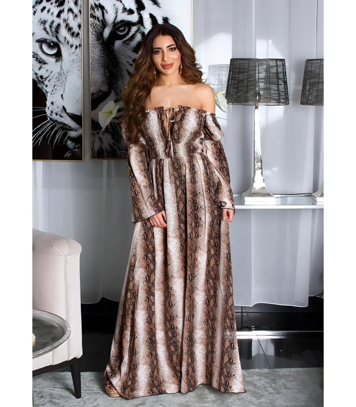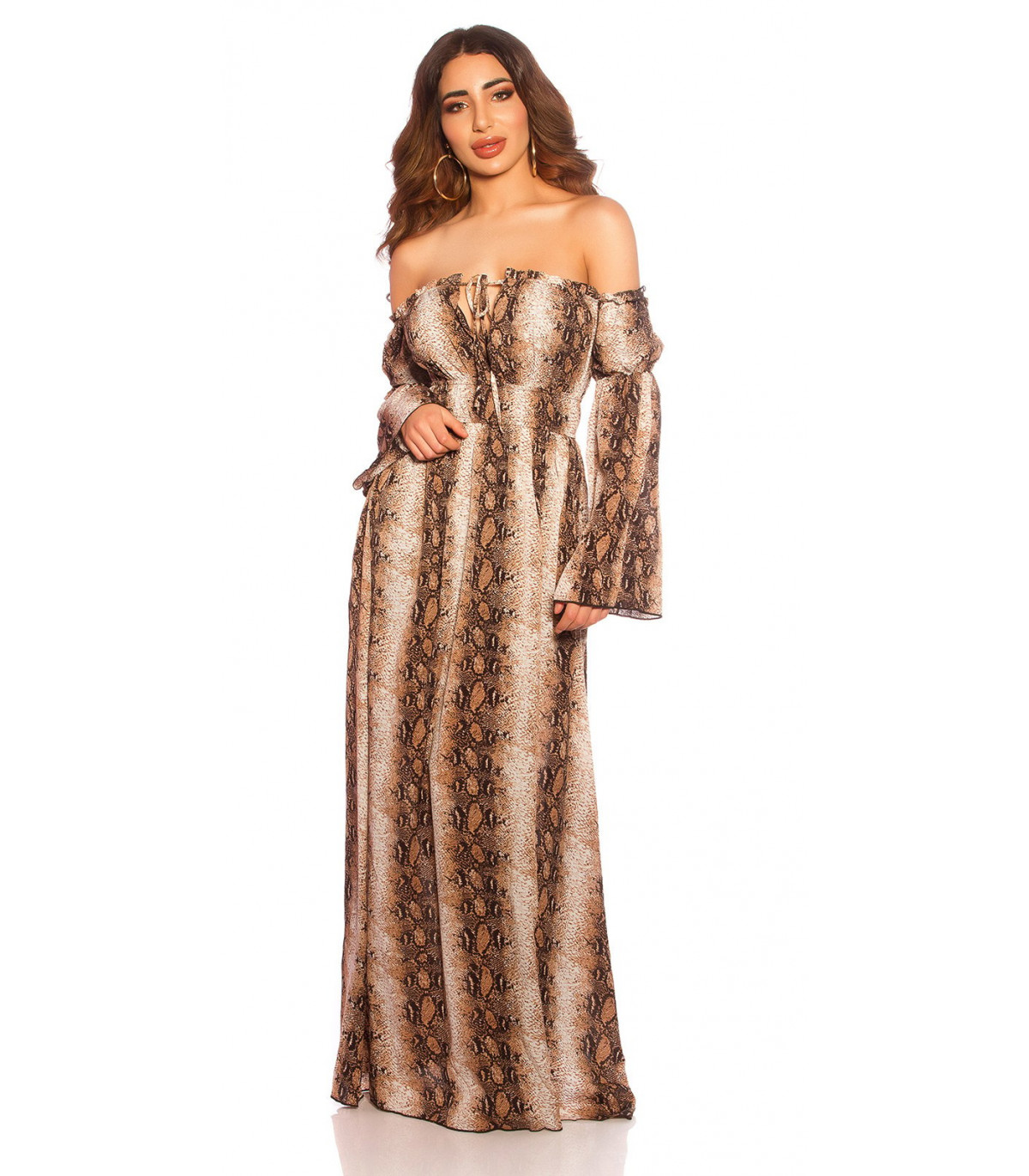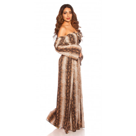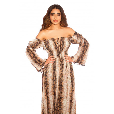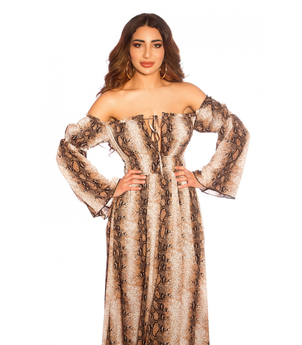 Käärmekuvioinen pitkähihainen off-shoulder mesh-maksimekko