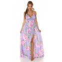 Koucla lila kukkakuvioinen v-maksimekko halkiolla