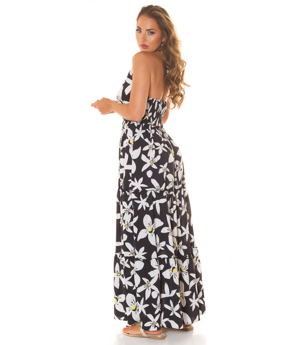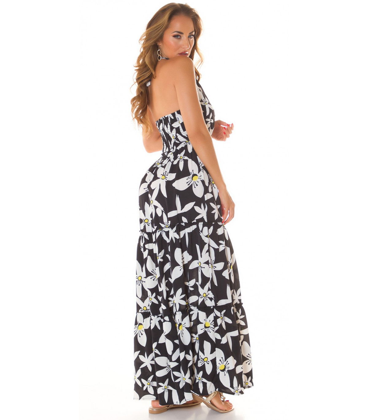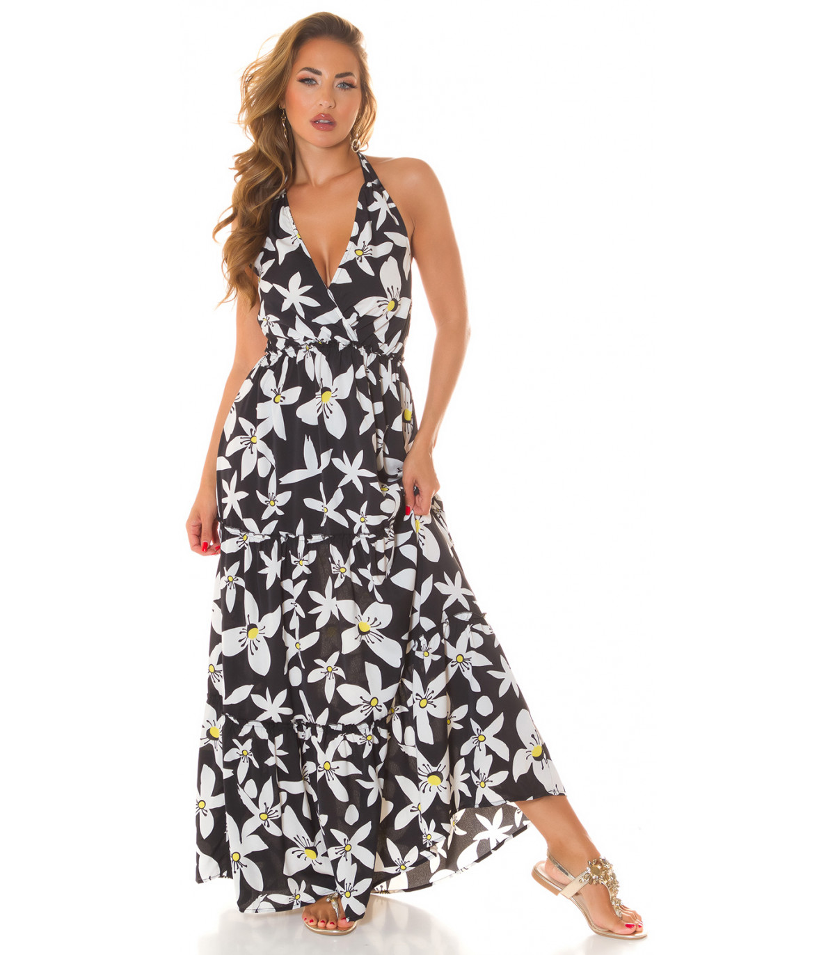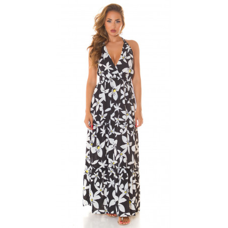 Koucla musta kukkakuvioinen halterneck v-maksimekko
