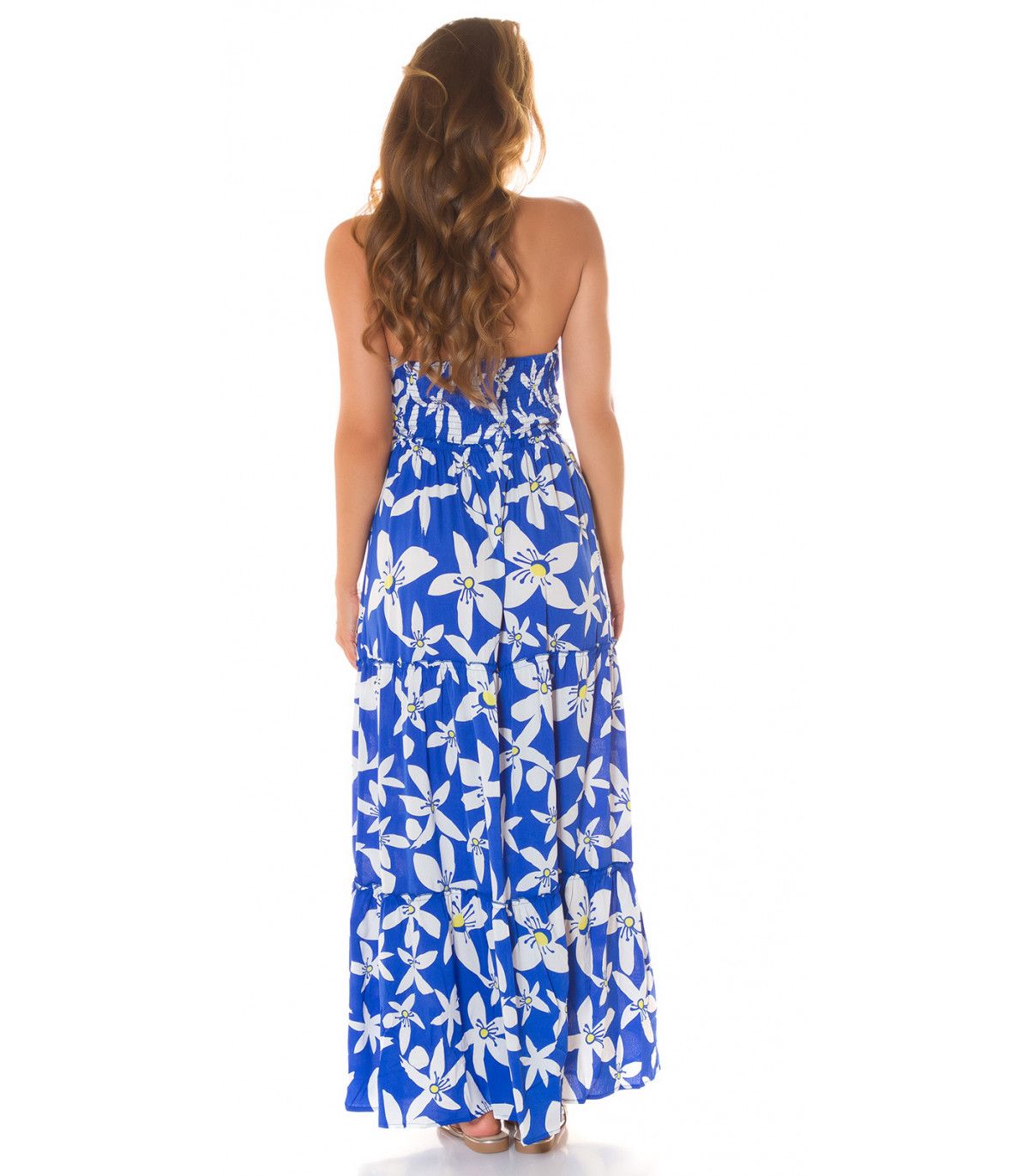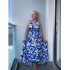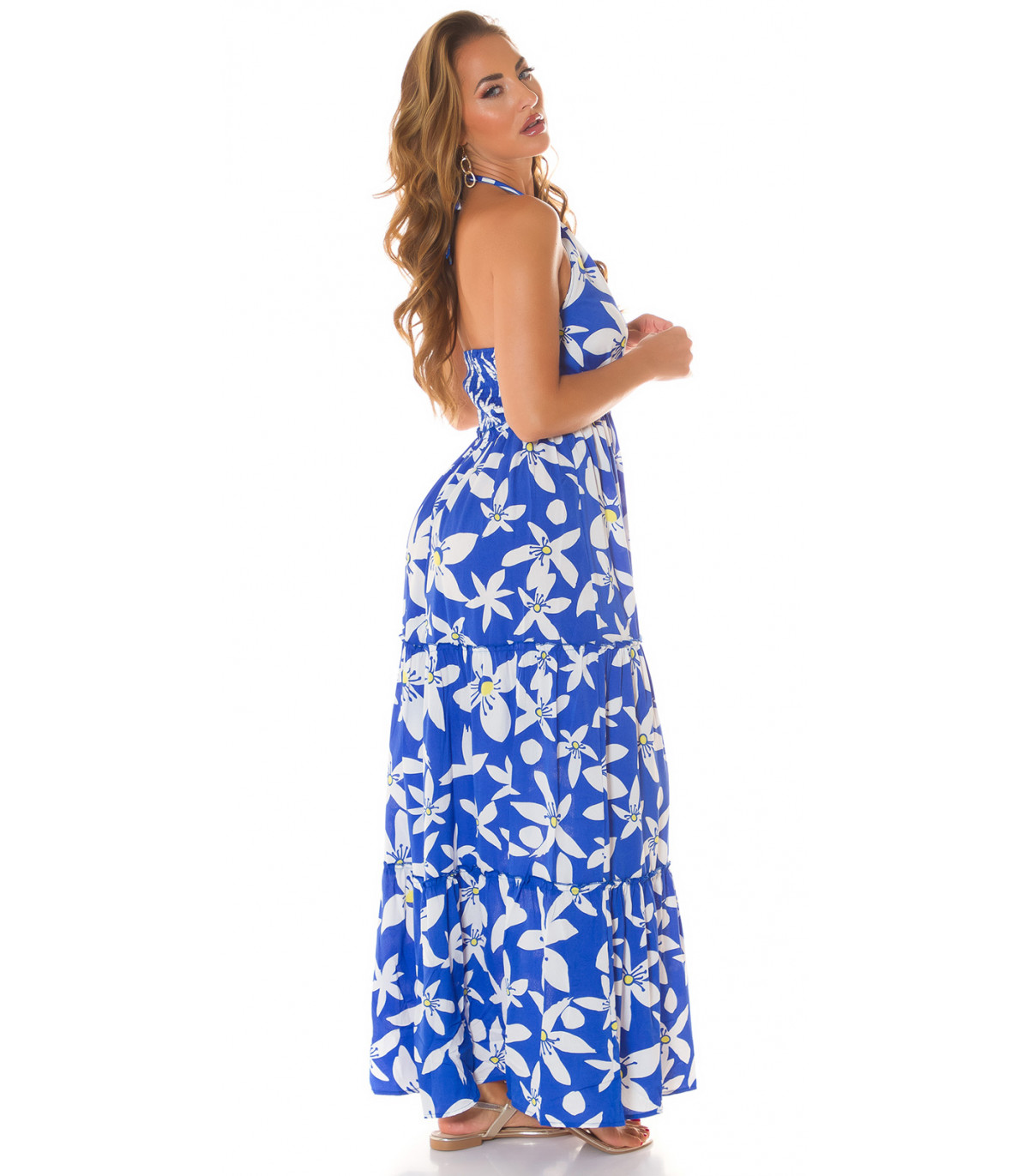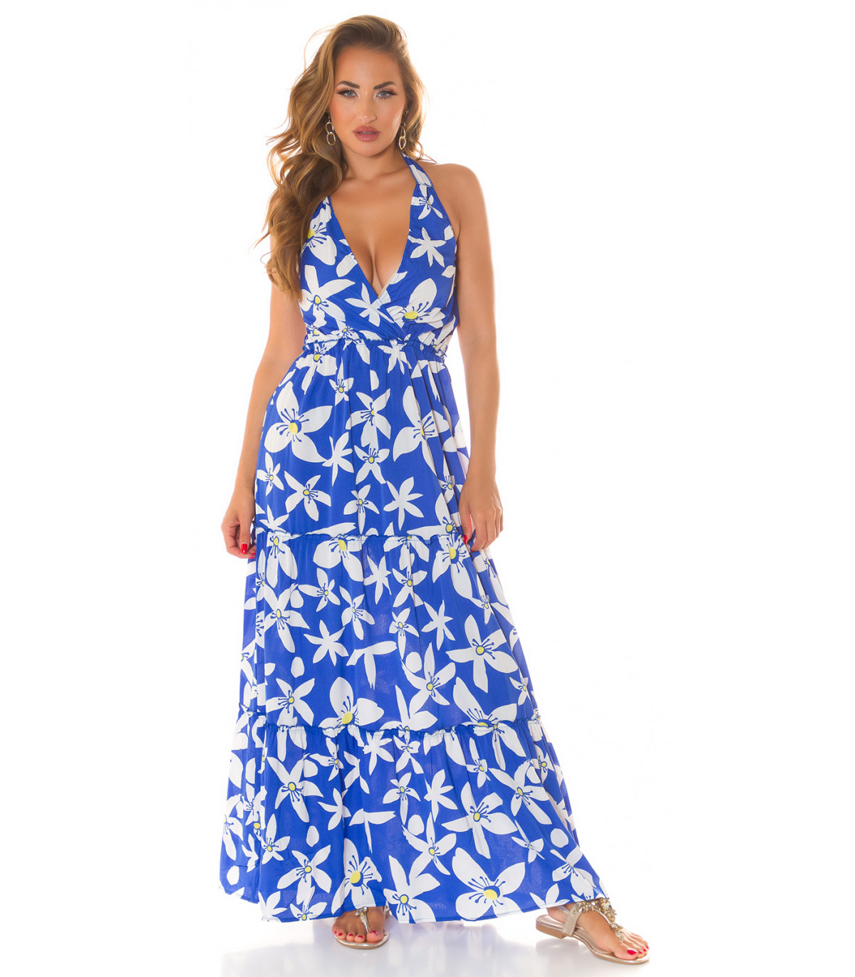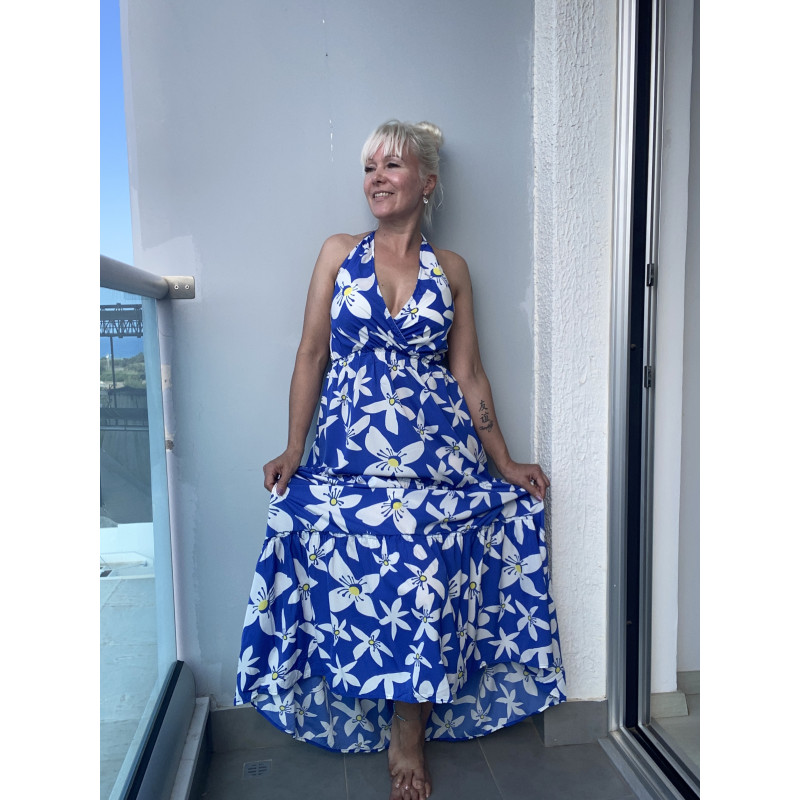 Koucla sininen kukkakuvioinen halterneck v-maksimekko