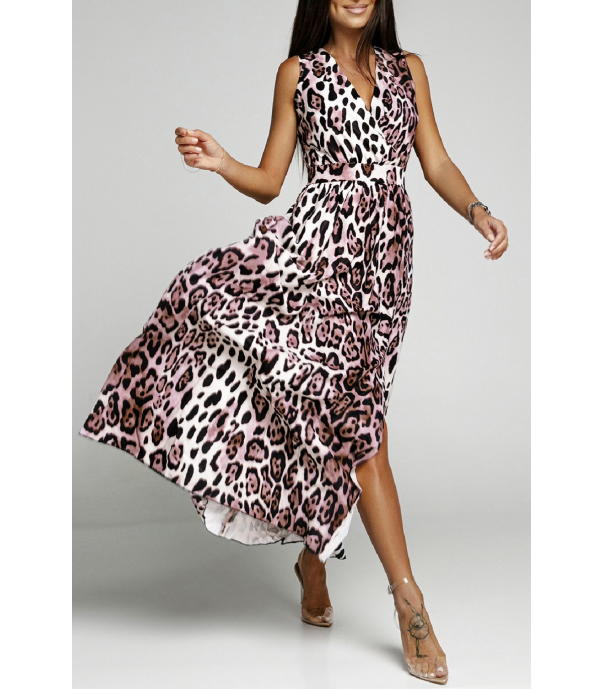 Leopardikuvioinen v-maksimekko rusettinauhoilla