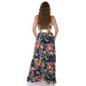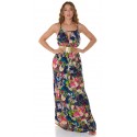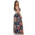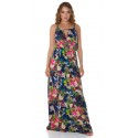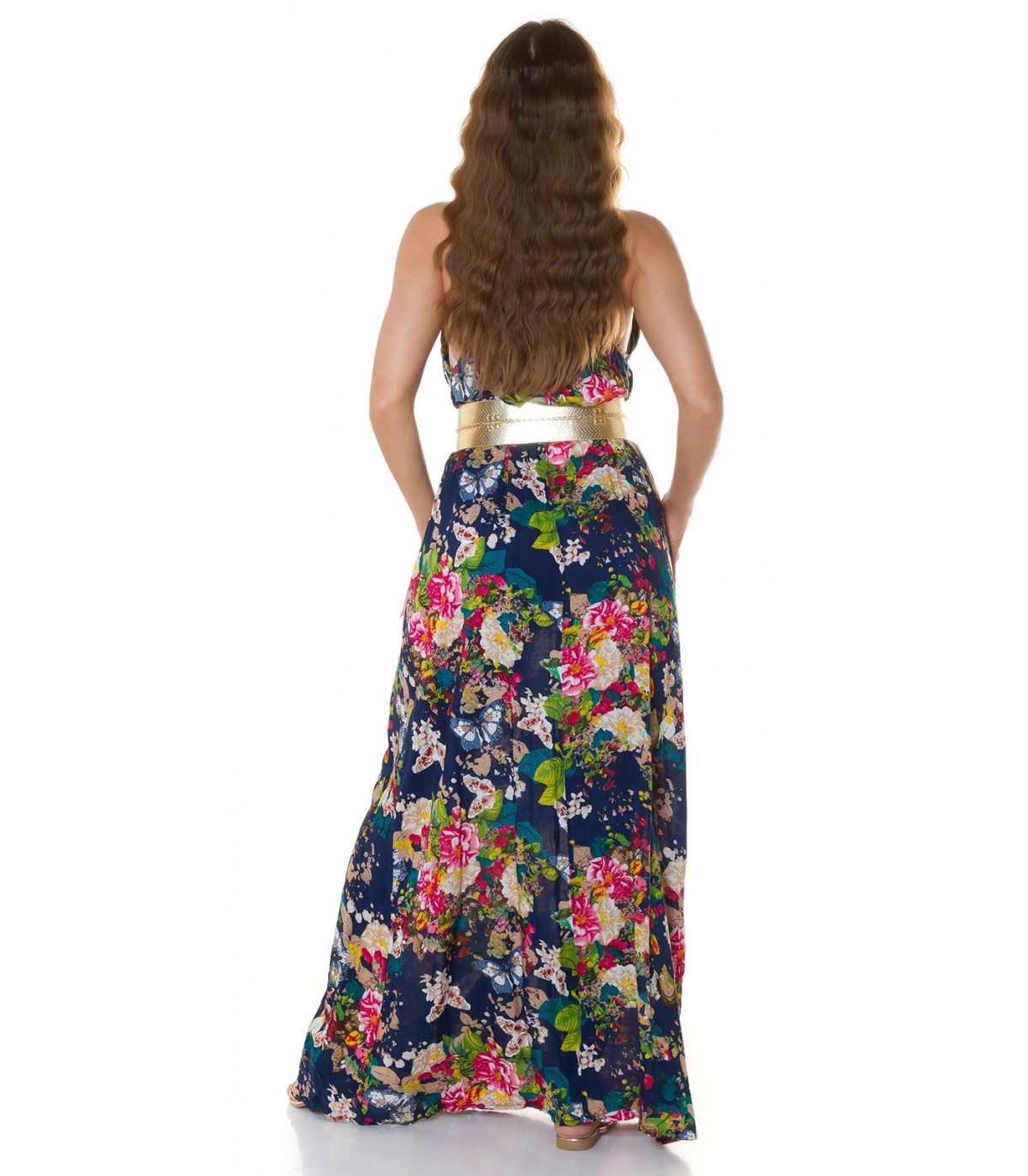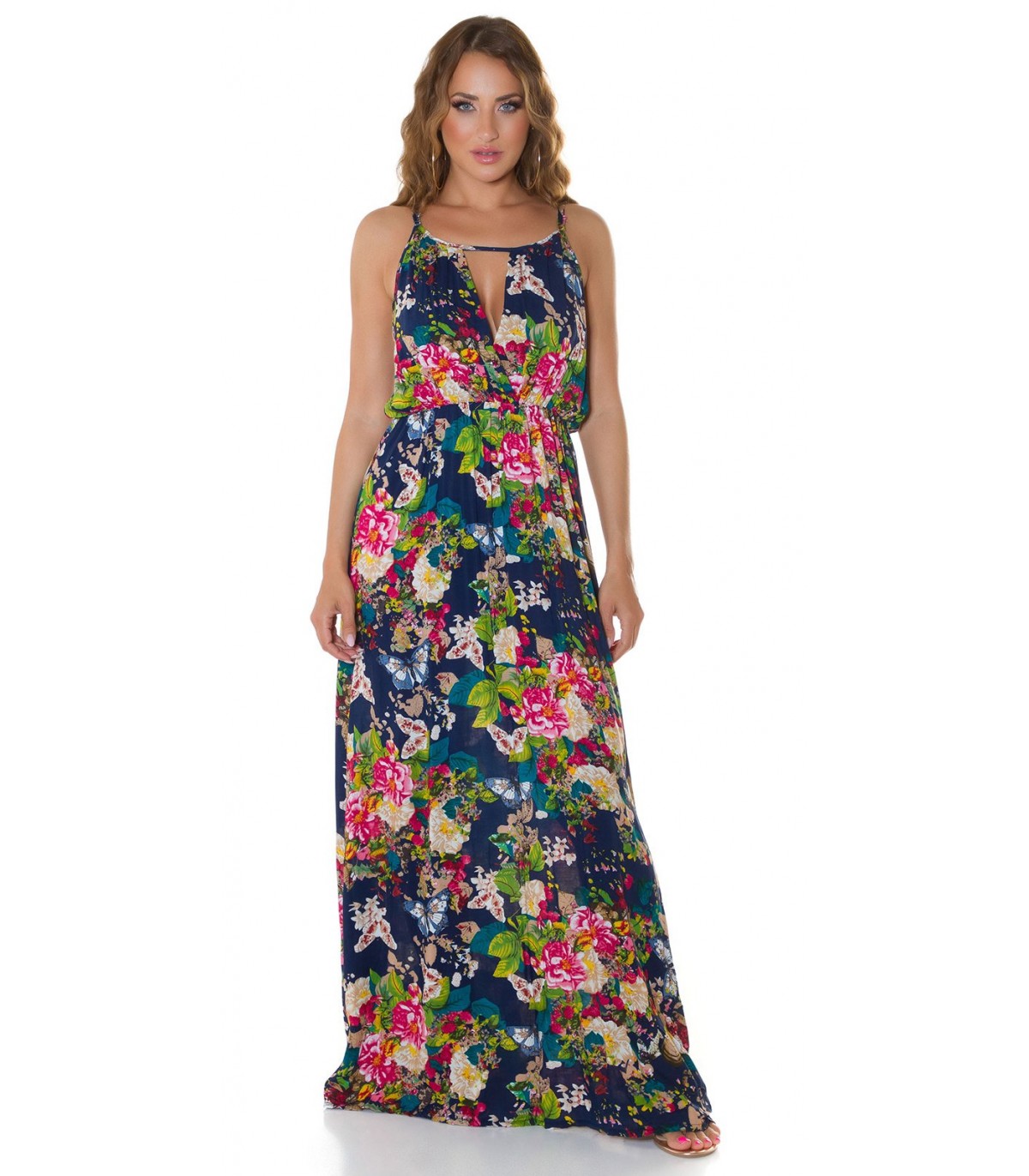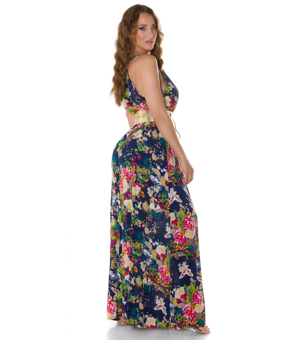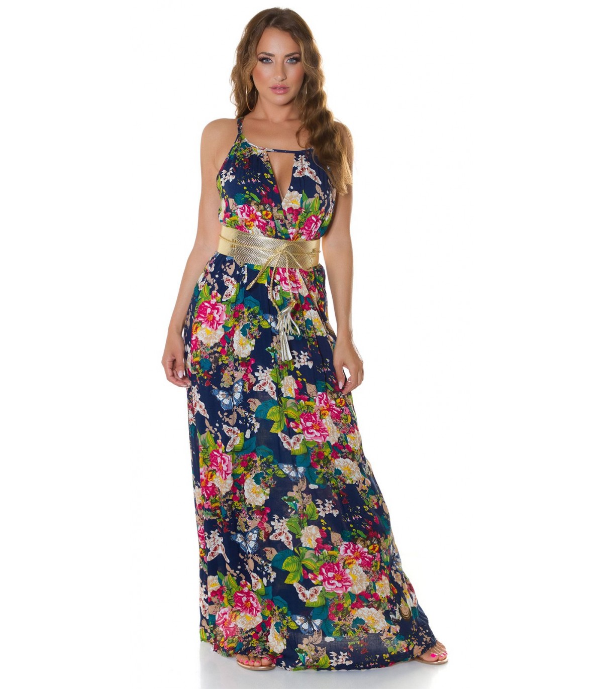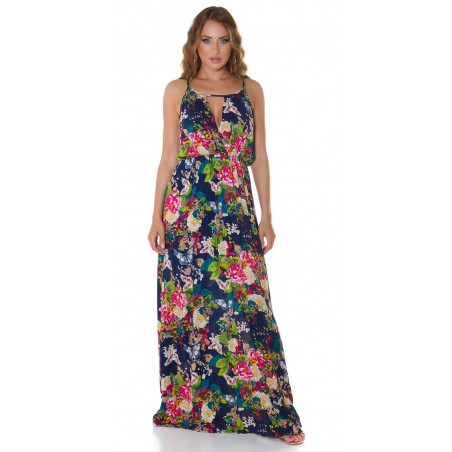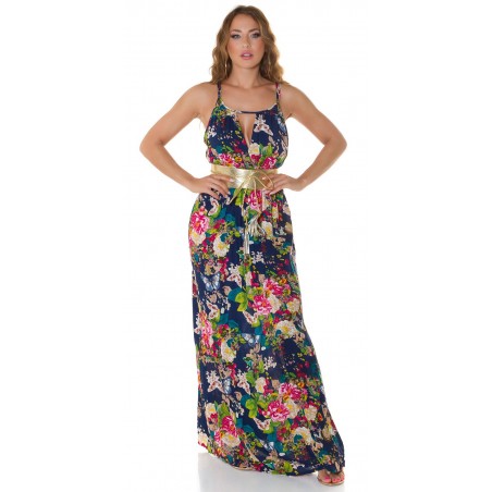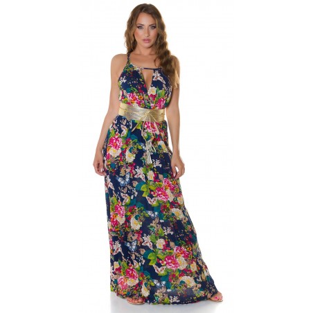 Tummansininen kukkakuvioinen maksimekko kurkistusaukolla ja säädettävillä olkaimilla. Sopii parhaiten n. 170-senttisille. Huom: Vyö ei sisälly tuotteeseen.