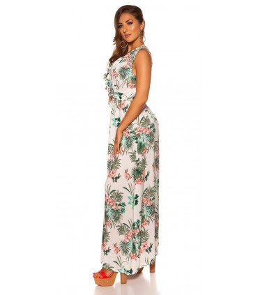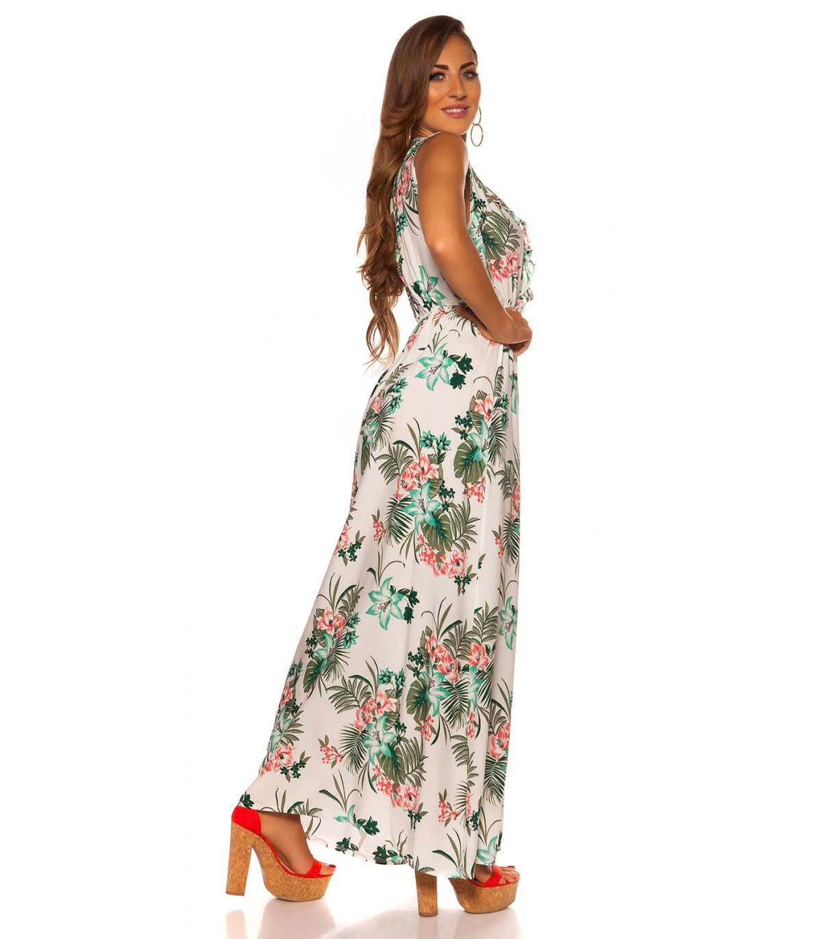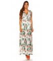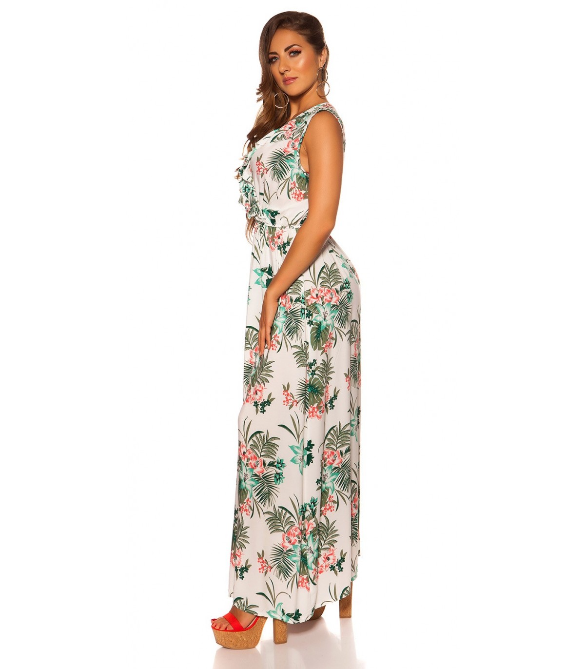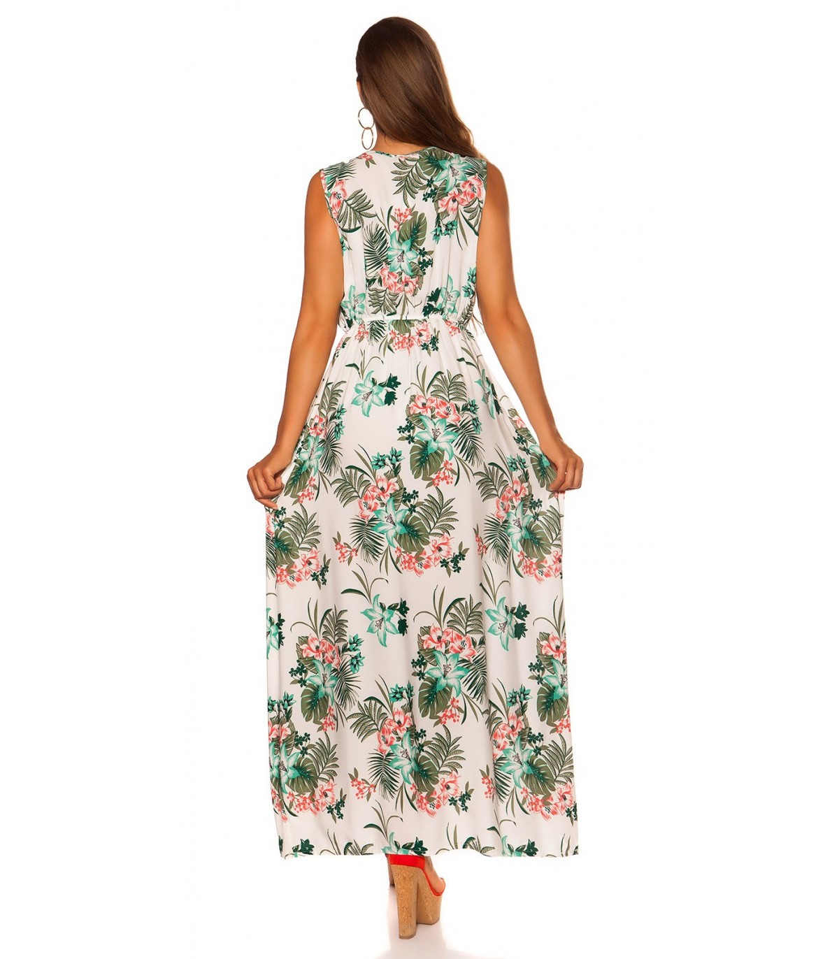 Valkoinen kukka- ja lehtikuvioinen v-maksimekko