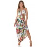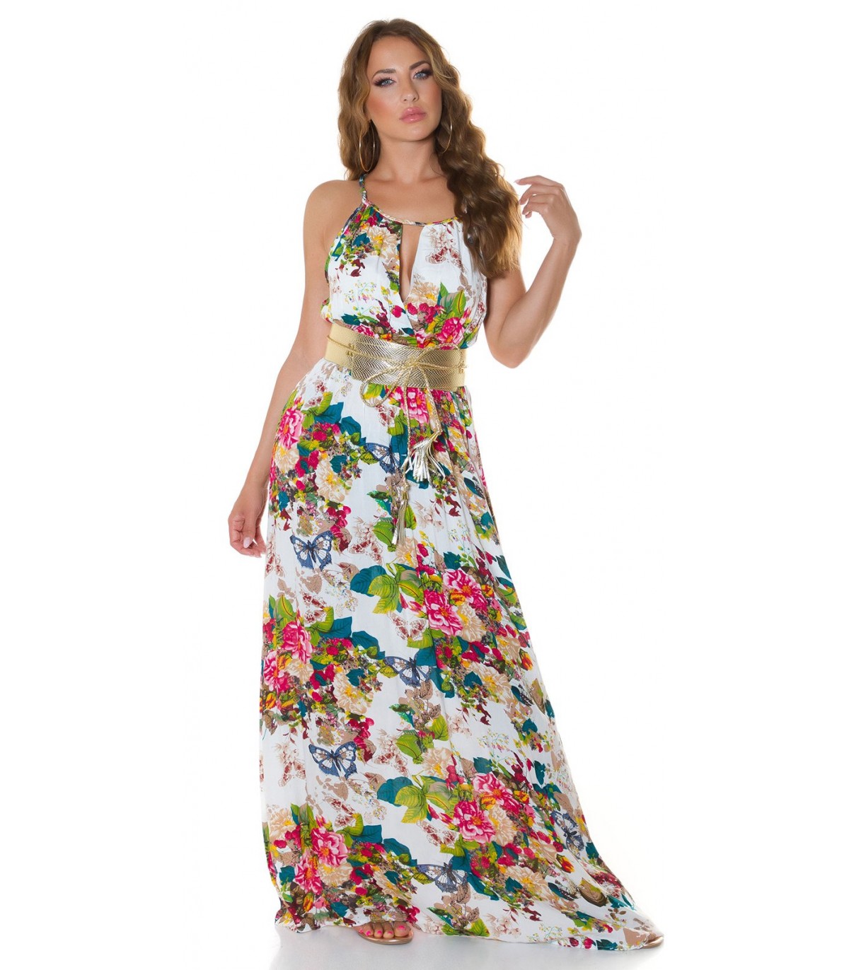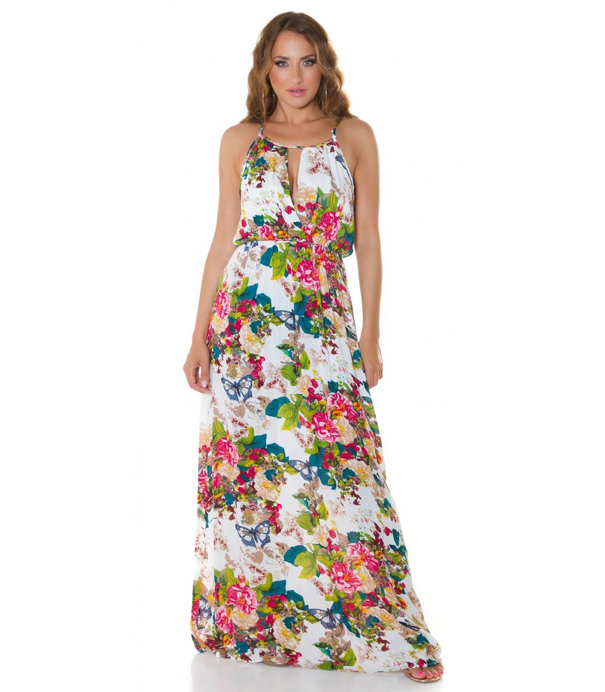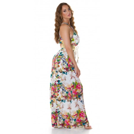 Valkoinen kukkakuvioinen maksimekko kurkistusaukolla