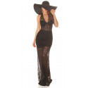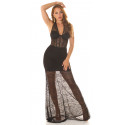 Upea musta halterneck pitsinen maksimekko. Tämä seksikäs pitsimekko kerää katseet, joten se sopii vain itsevarmoille naisille. Upea pitsinen juhlamekko näyttää parhaalta ilman rintaliivejä, ja rintojen kohdalla olevat kupit sopivat parhaiten melko pienirintaisille (A-B -kuppi, max n. C-kuppi) naisille. Läpikuultava pitsinen helma sekä vyötäröllä oleva korsettityylinen osa ovat yksityiskohtia, jotka herättävät ihastusta. Musta pitsinen pitkä mekko on rohkean tyylikäs iltapuku, jossa on punaisten mattojen glamouria.
