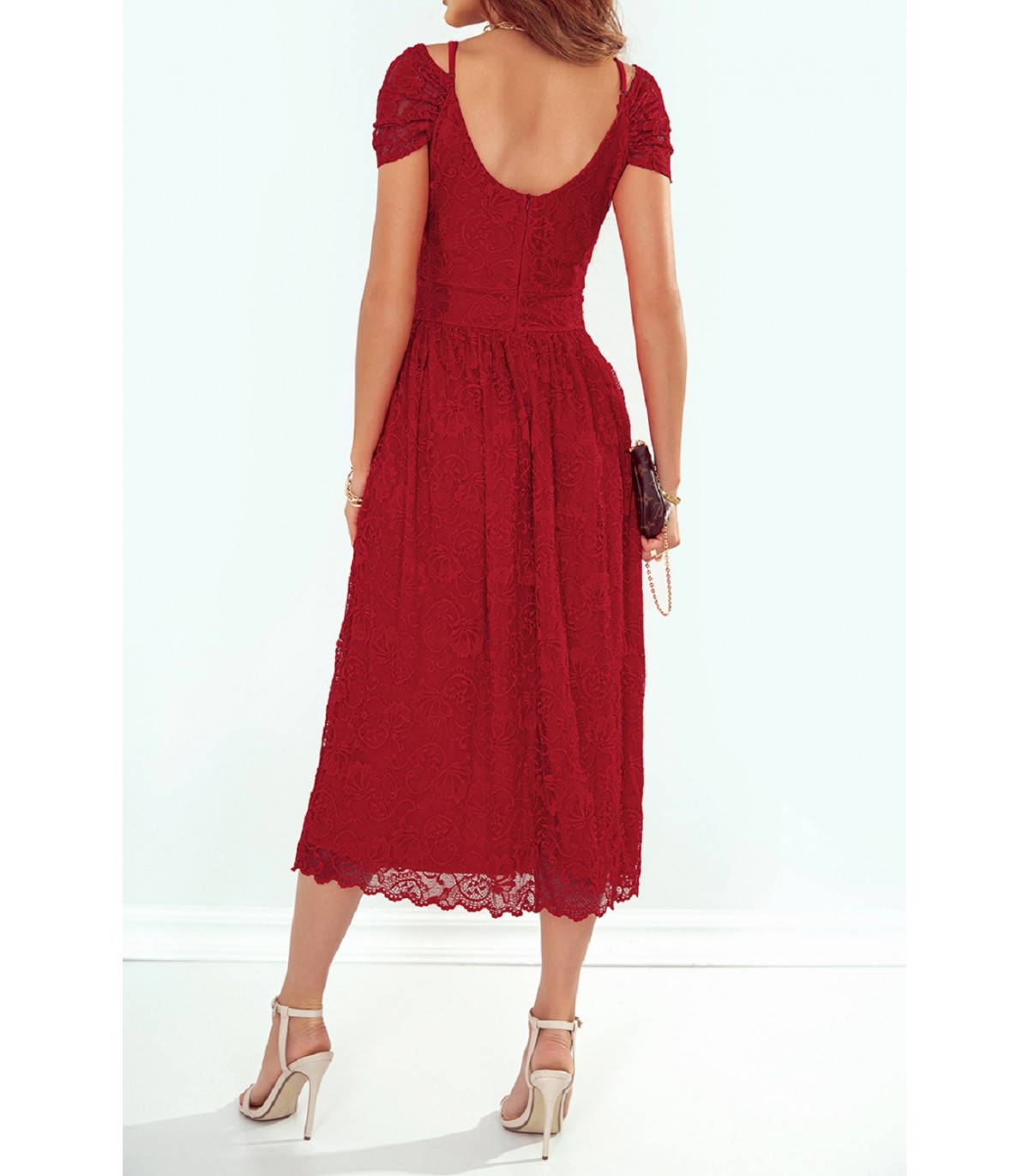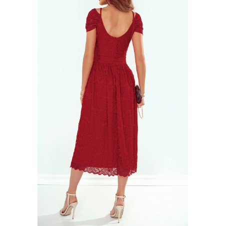 Elegantti punainen olkapäät paljastava pitsimekko olkaimilla. Käsinpesu.